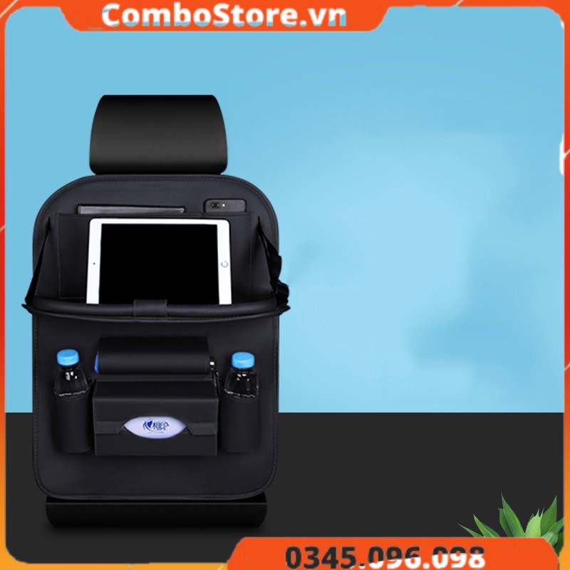 - Túi để đồ treo lưng ghế ô tô có bàn, tích hợp 7 vị trí để đồ tiện lợi, có thể chứa nhiều vật dụng cùng một lúc như chai nước uống, giấy tờ tài liệu, điện thoại, đặc biệt có hộp đựng khăn giấy và rất nhiều đồ đạc khác.