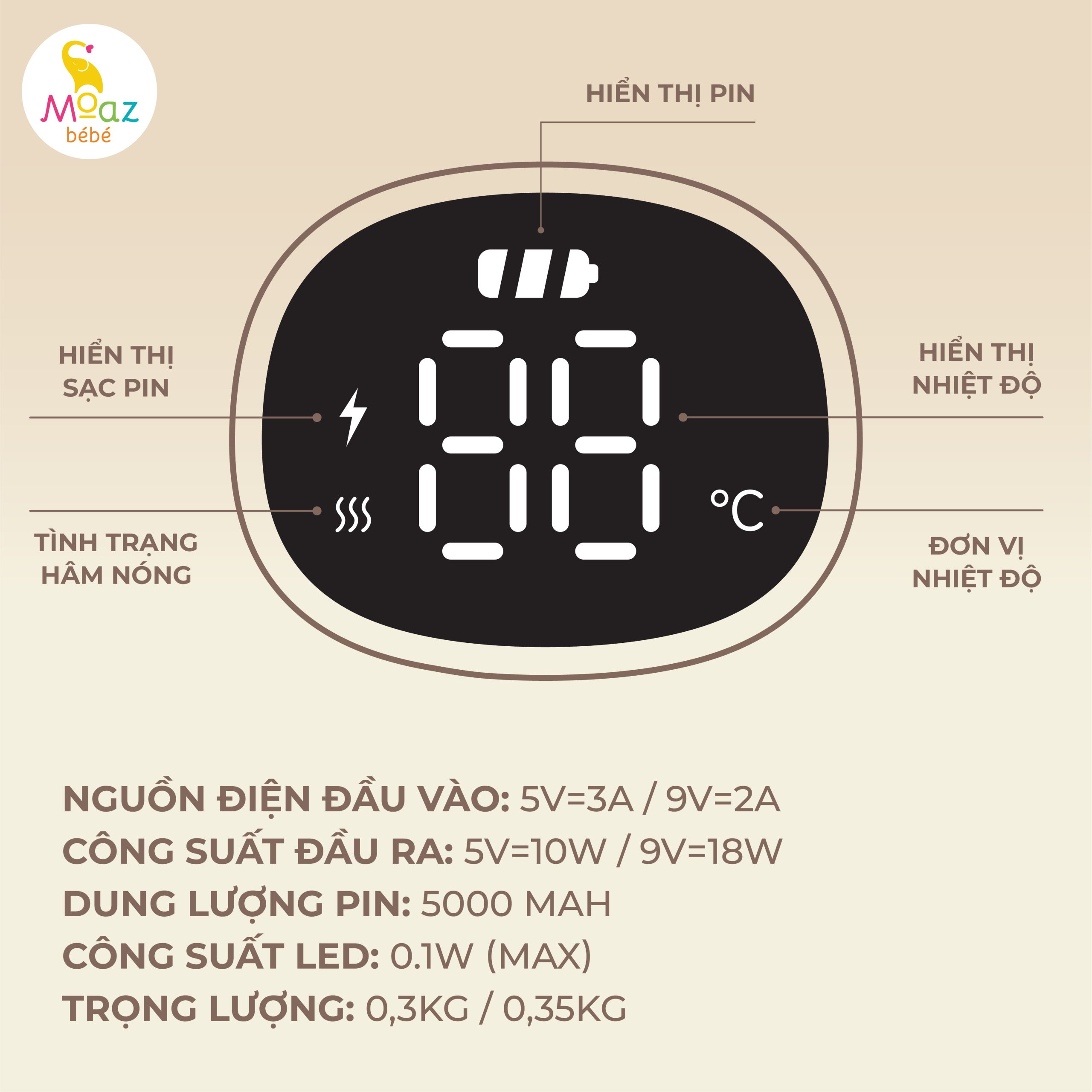 Ưu điểm túi ủ bình sữa tích điện di động Moaz MB 081-Thiết kế nhỏ gọn, sang trọng-Chất liệu da PU và nhựa ABS an toàn, chịu nhiệt tốt-Màn hình led thông minh hiển thị chức năng, thiệt độ, dung lượng p...