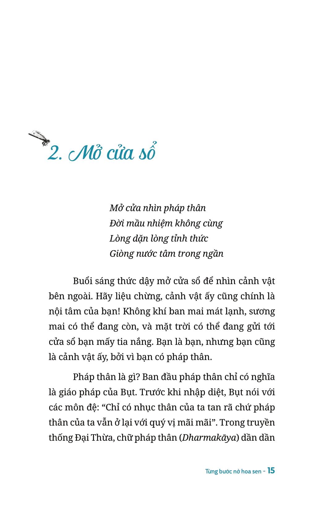 Từng bước nở hoa sen của Thiền sư Thích Nhất Hạnh là một trong những quyển sách "dạy" ta cách sống an nhiên như thế. Bốn mươi bảy bài kệ trong sách cũng là bốn mươi bảy bài học giúp ta tu tập chánh niệm mỗi ngày, hướng đến sự an lạc trong cả tâm, thân và sống hết mình cho từng giây phút hiện tại.