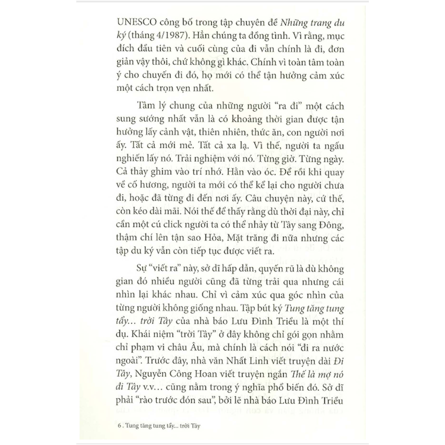 Mua tại TiktokTập bút ký "Tung tăng tung tẩ trời Tây" của nhà báo Lưu Đình Triều không chỉ miêu tả cảnh vật, danh lam thắng cảnh, công trình văn hóa nghệ thuậ anh còn ghi nhận tâm lý, tính cách của con người nơi ấy. Đó chính là "máu nghề nghiệp" của nhà báo khi truyền tải một thông tin, không chủ quan, võ đoán mà còn tiếp cận câu trả lời của người dân bản địa. Với nhà báo, khi du lịch không chỉ đi để đi, mà còn là dịp quan sát, nhận xét và ghi chép…