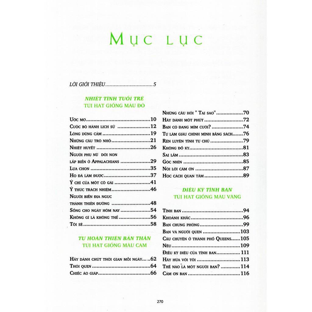 Cuốn sách này là một lời nhắn gửi, một món quà tinh thần, một cái hộp nhỏ chứa bảy túi hạt giống, với bảy sắc màu nuôi dưỡng sức mạnh và lòng dũng cảm cho bạn trẻ. Hy vọng cuốn sách này có thể tiếp tục truyền lửa, tạo thêm động lực, chắp cánh ước mơ,… lấy đó làm giá trị cốt lõi dẫn bước bạn trẻ vào đời, cùng các bạn đối mặt với cuộc sống và vượt qua những thử thách
