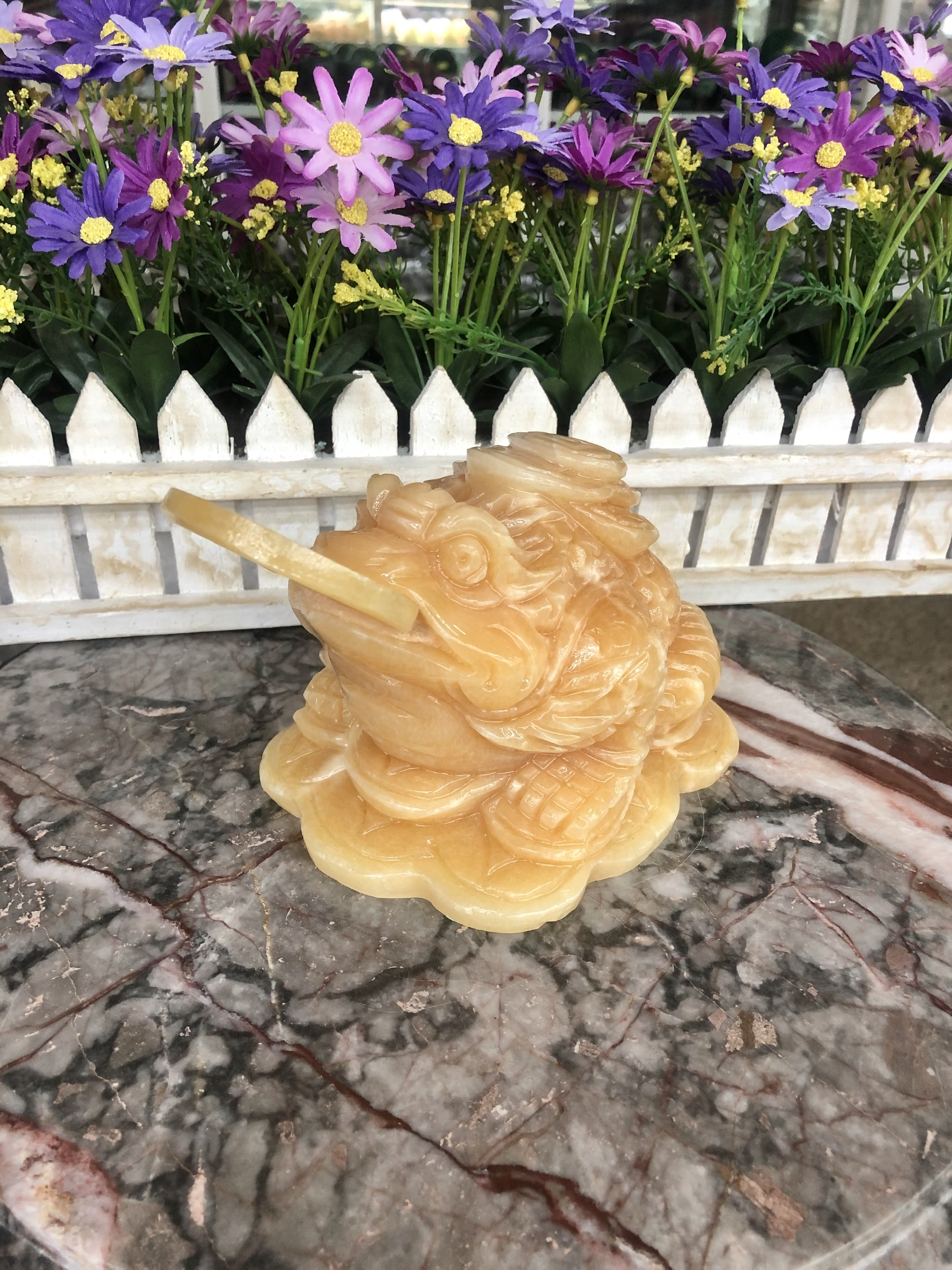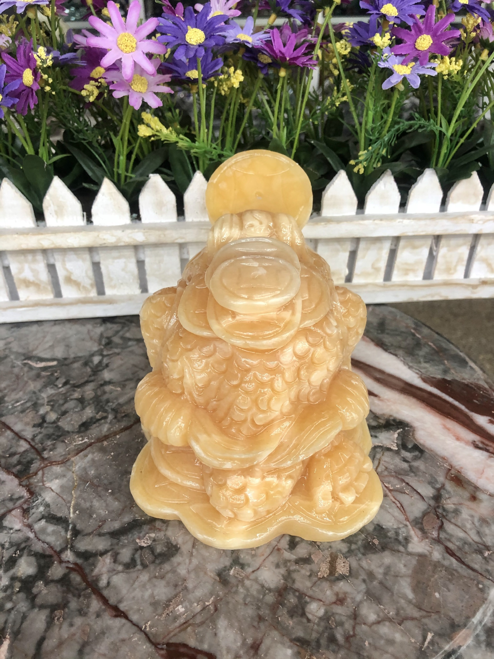 Chất liệu: Đá cẩm thạch vàng cà rốt Kích thước: Dài 20 cm x Rộng 18 cm x Cao 17,5 cm Khối lượng: 9,3 kg