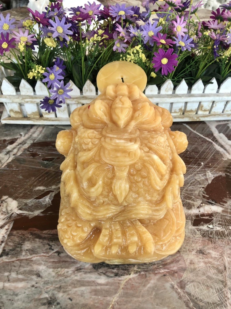 Chất liệu: Đá cẩm thạch vàng cà rốt Kích thước: Dài 20 cm x Rộng 18 cm x Cao 17,5 cm Khối lượng: 9,3 kg