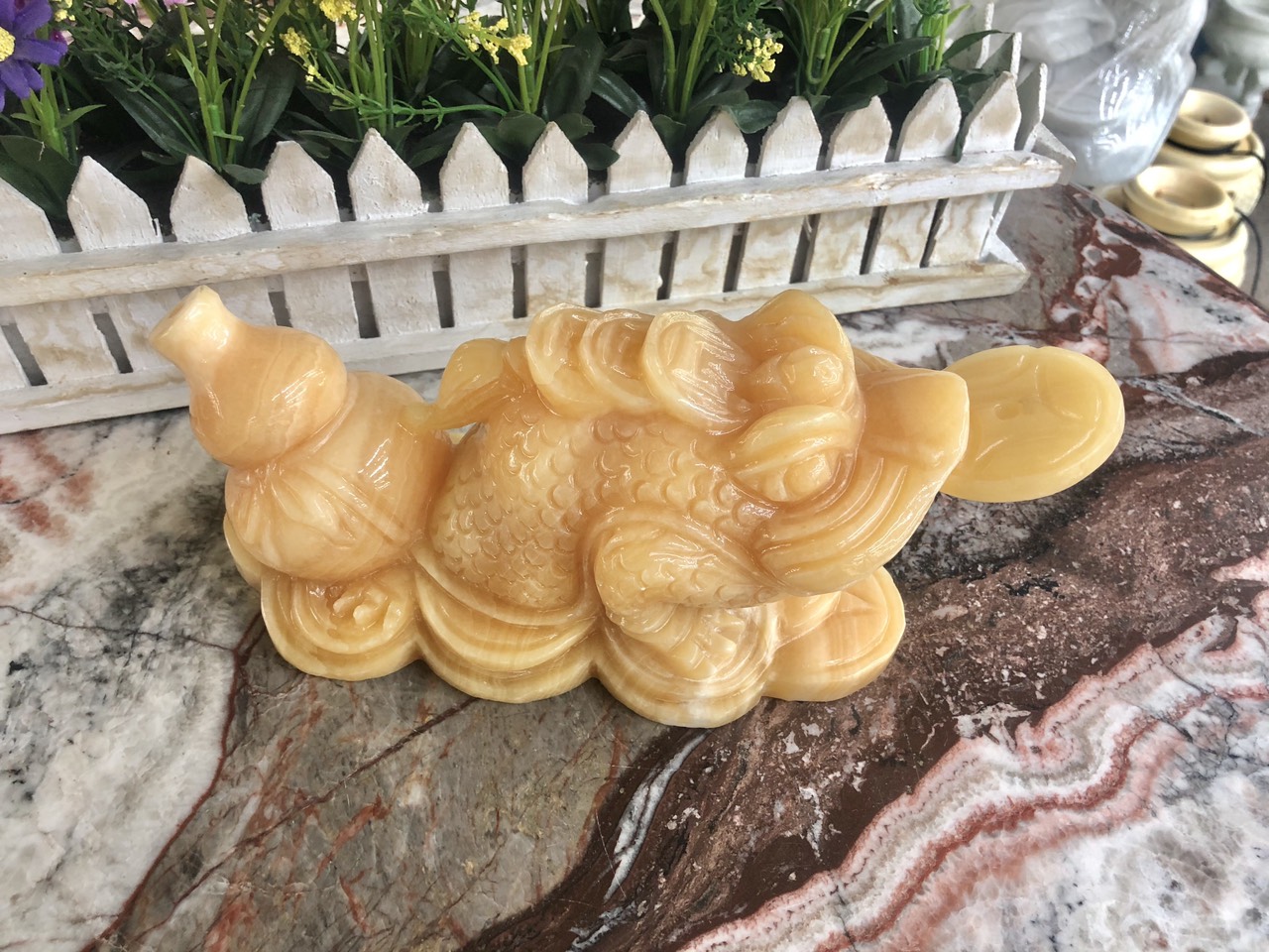 Chất liệu: Đá cẩm thạch vàng cà rốt Kích thước: Dài 20 cm x Rộng 18 cm x Cao 17,5 cm Khối lượng: 9,3 kg