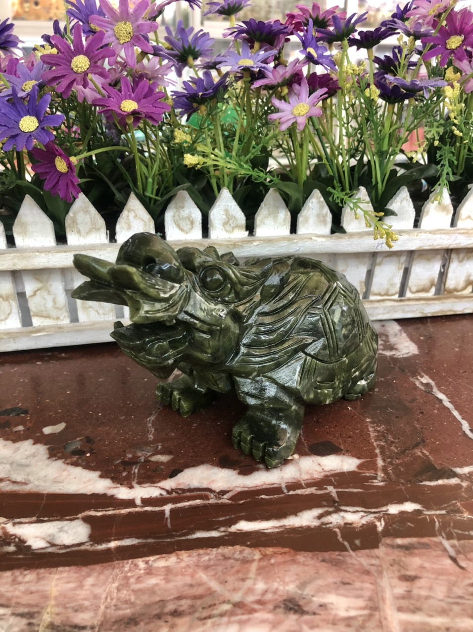 Chất liệu: Đá ngọc hoàng long Kích thước: Dài 12 cm x Rộng 8 cm x Cao 8,5 cm Khối lượng: 890g Trong truyền thuyết Long Sinh Cửu Phẩm (Chín đứa con của rồng) thì