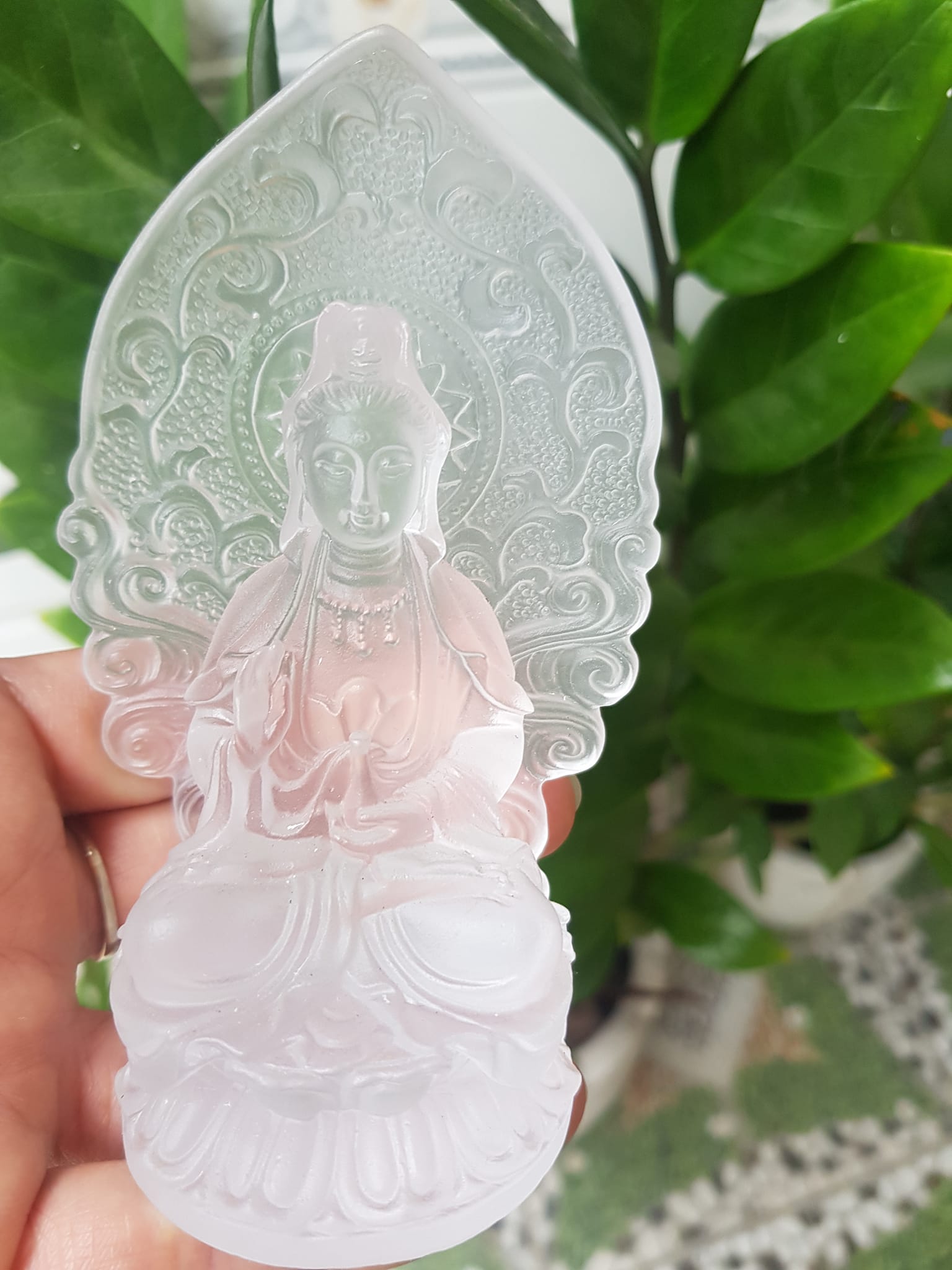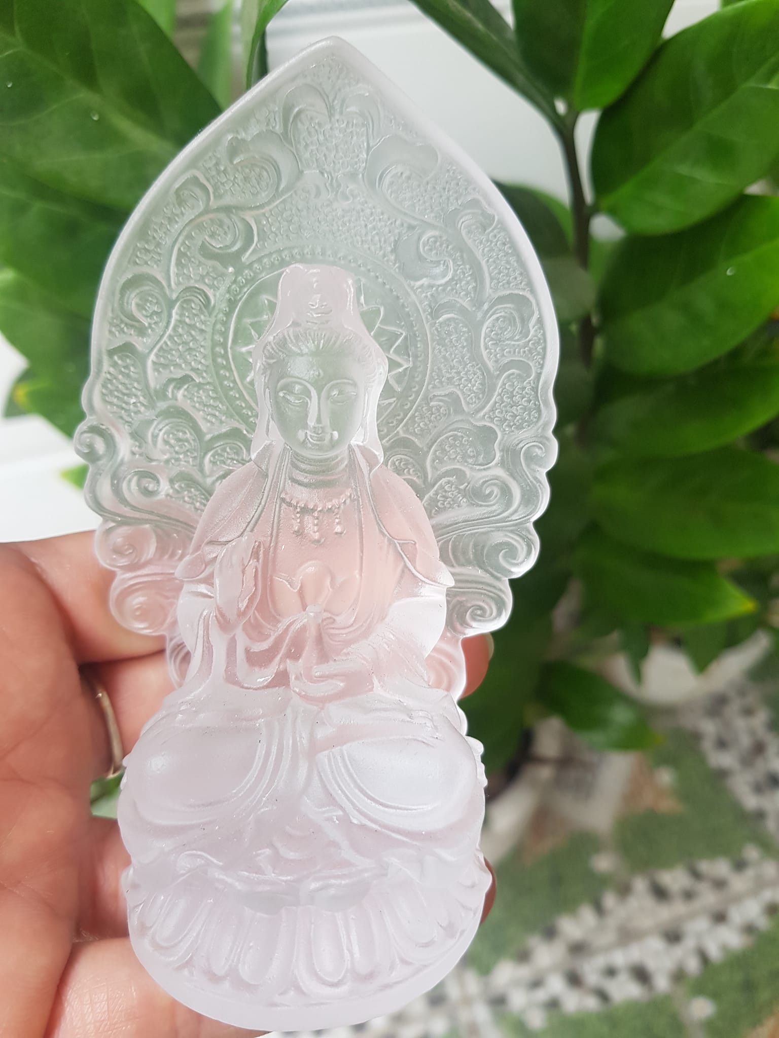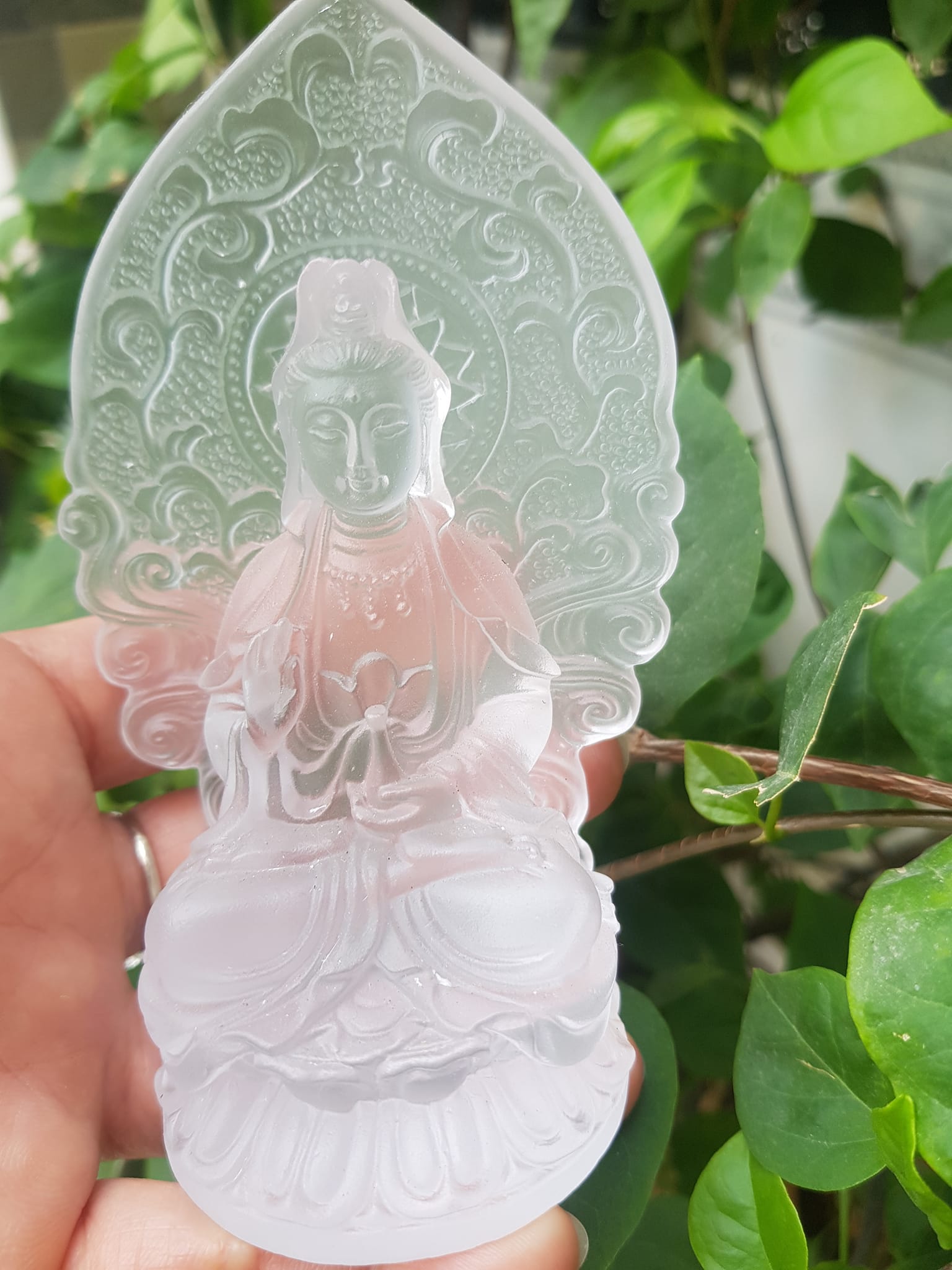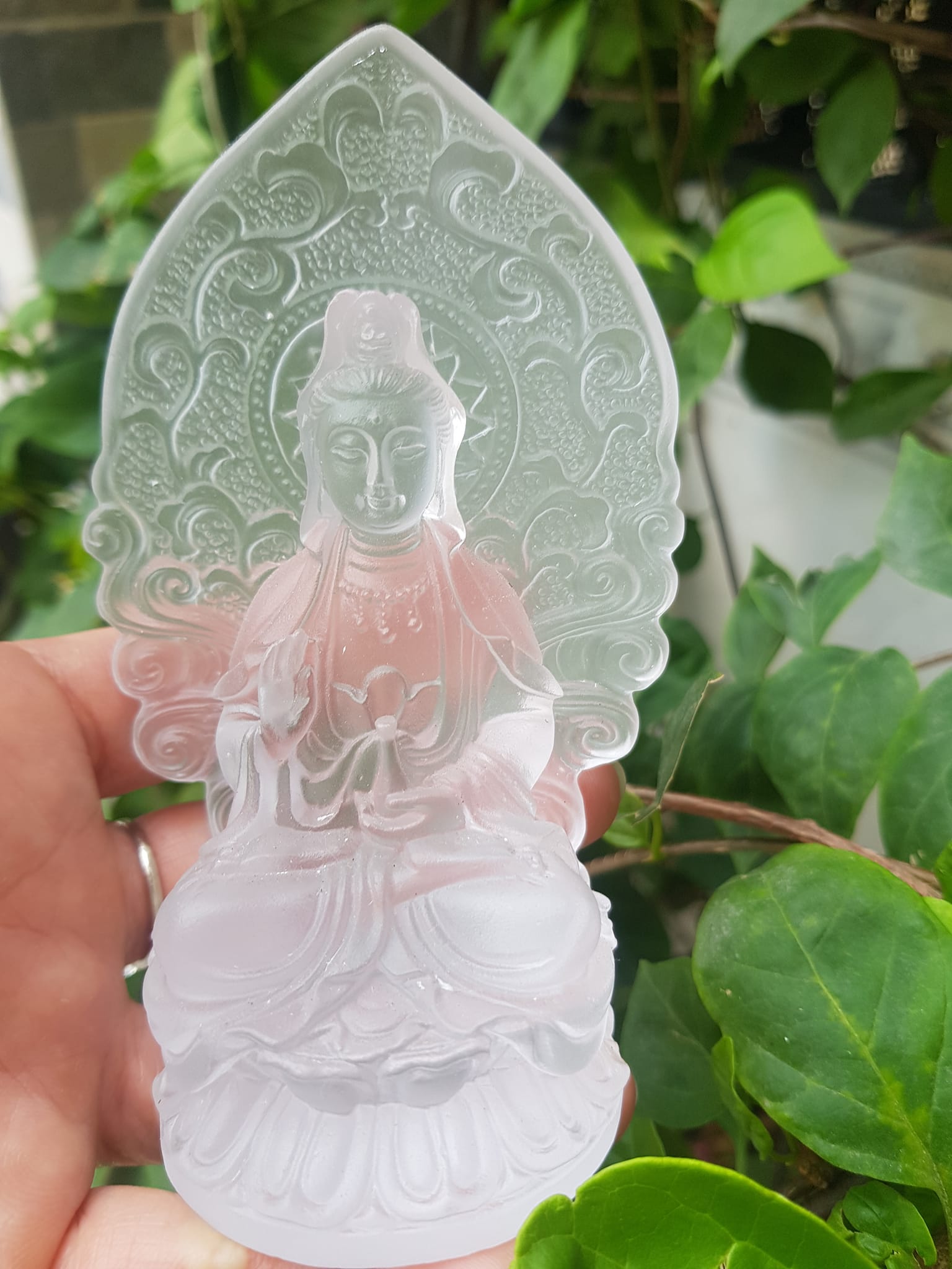 💐💐☘️TƯỢNG PHẬT BÀ QUAN ÂM MỚI ĐÁ LƯU LY TRẮNG TINH ĐỂ TRONG XE HƠI hoặc BÀN cao 12cm x 7cm x đế 5cm