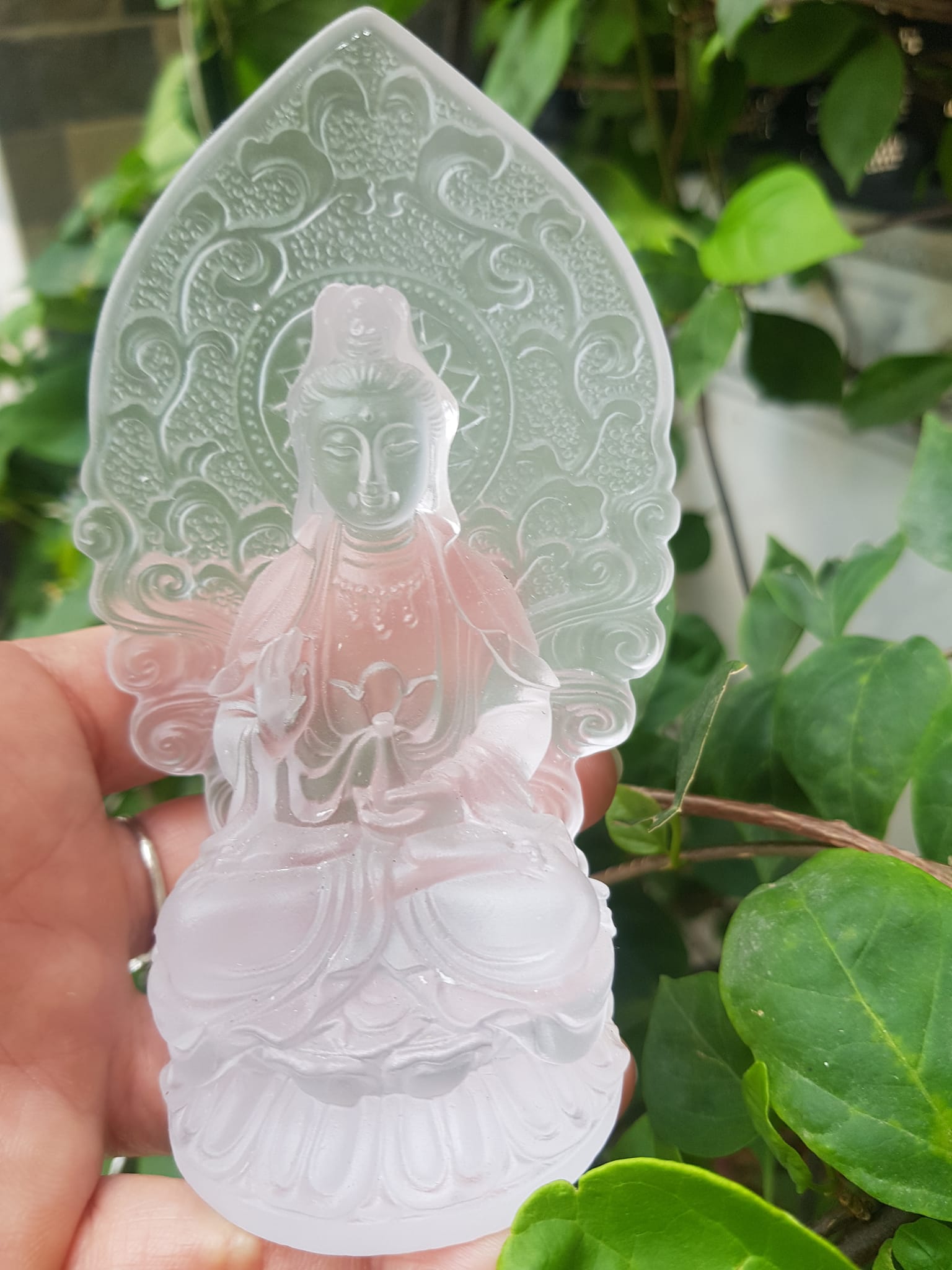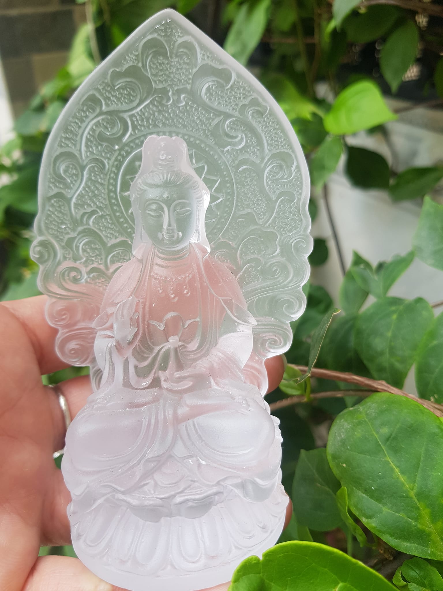 💖💖TƯỢNG PHẬT BÀ QUAN ÂM 2 MẶT ĐÁ LƯU LY ĐỂ TRONG XE HƠI hoặc BÀN cao 10cm đk 6cm - SUNNY Q8