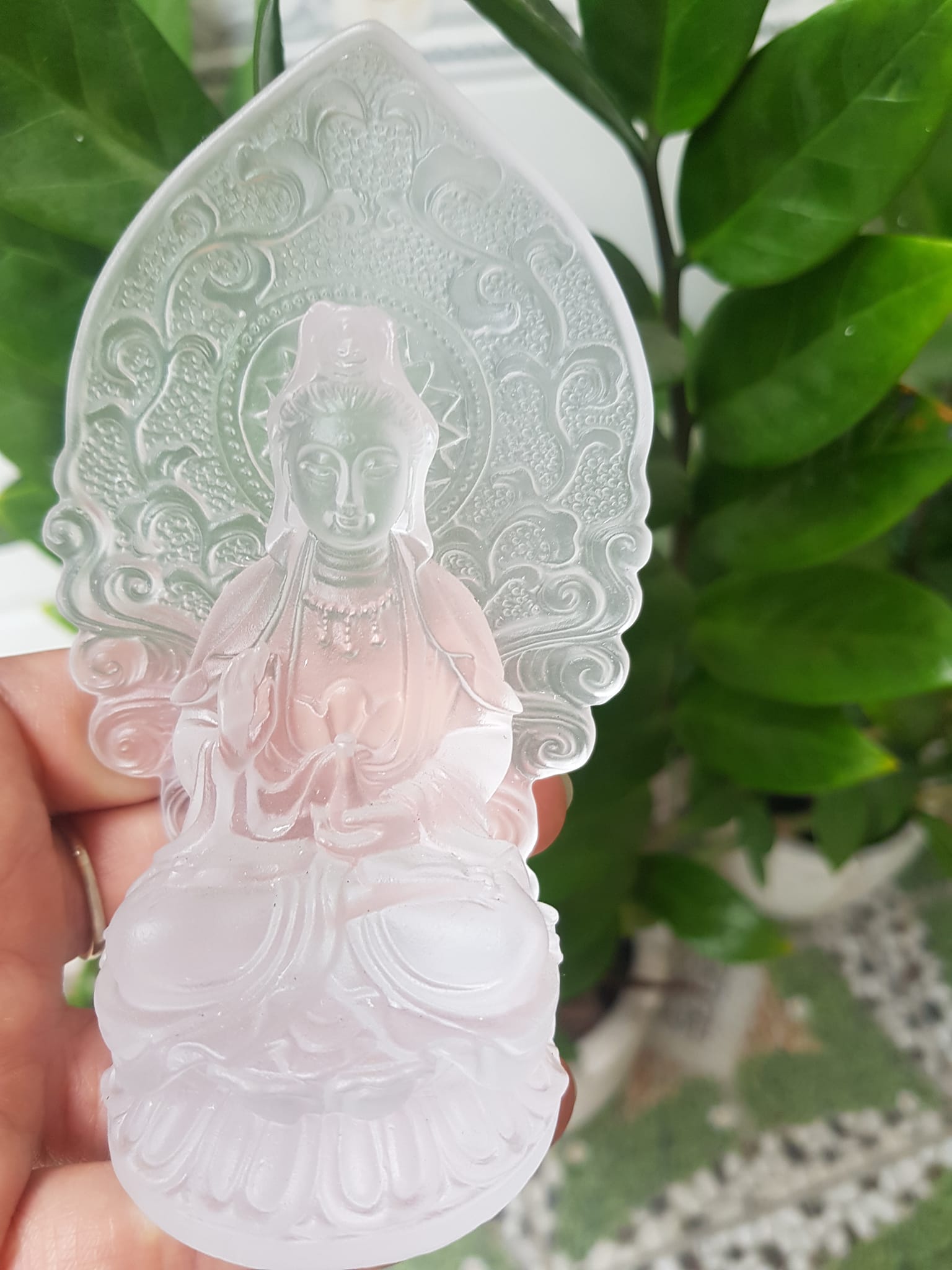Tượng Phật Bà Quan Âm Mới Đá Lưu Ly Hồng Để Trong Xe Hơi hoặc trên bàn cao 12cm đk 7cm đế 5cm hợp Anh Chị Mệnh Hỏa mệnh Thổ ạ *** Tượng Phật Bà