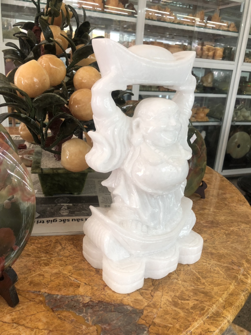 ✨Tượng Phật Di Lặc đứng đỡ thỏi ngân lượng đá trắng - Cao 30 cm