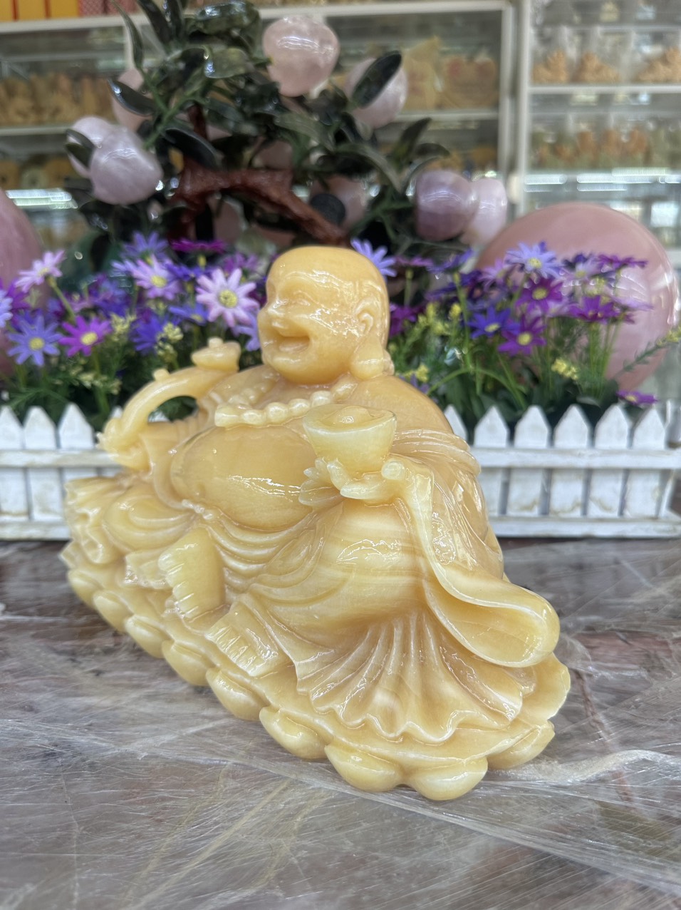 Chất liệu: Đá ngọc Hoàng Long Kích thước: Dài 50 cm x Rộng 20 cm x Cao 34 cm Khối lượng: 40 kg Phật Di Lặc trong Phong thủy Còn gọi là "Phật Cười", Di