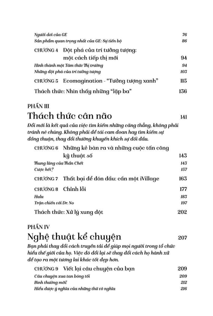 Cuốn sách là tập hợp những câu chuyện và bài học mà tác giả đả đúc rút được trong hành trình đó; bà thử thách những doanh nghiệp lớn ngừng tìm kiếm sự hoàn hảo mà thay vào đó tìm kiếm những xu hướng đang lên, mạnh dạn chấp nhận nguy cơ, và thường xuyên thử nghiệm những ý tưởng táo bạo. Bà biết việc thay đổi tư duy và văn hoá của một doanh nghiệp không hề dễ dàng và cũng chẳng hề có đường tắt, nhưng mỗi người đều có thể trở thành người “tạo nên thay đổi” bằng cách để trí tưởng tượng dẫn lối.