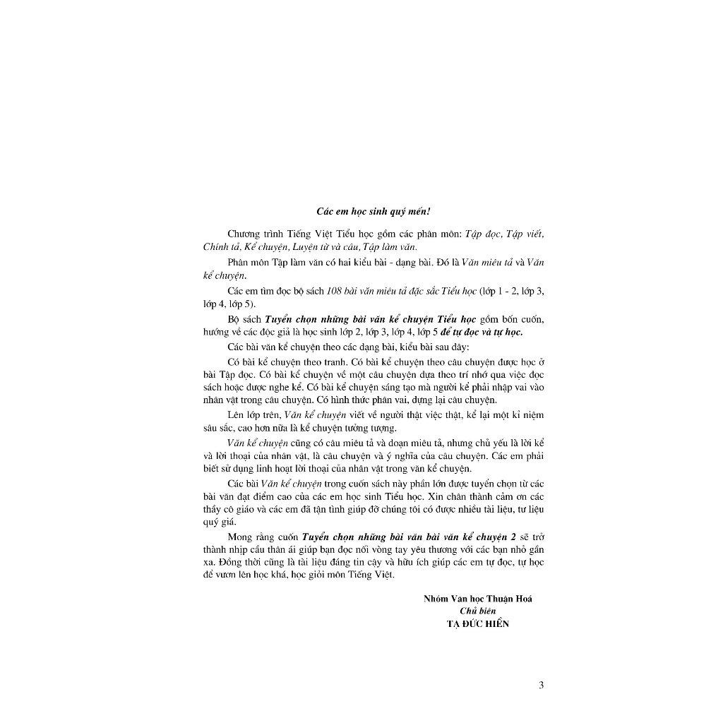 "Tuyển chọn những bài văn kể chuyện" bao gồm 4 cuốn, chia theo các lớp ở bậc tiểu học từ lớp 2 đến lớp 5. Sách được biên soạn với mong muốn giúp các em học sinh có thêm tài liệu tự đọc và tự học.Các bài văn kể chuyện theo các dạng bài, kiểu bài sau: kể chuyện theo tranh, kể chuyện theo câu chuyện được học ở bài Tập đọc, kể chuyện về một câu chuyện dựa theo trí nhớ qua việc đọc sách hoặc được nghe kể. Có bài kể chuyện sáng tạo mà người kể phải nhập vai vào nhân vật trong câu chuyện, có hình thức phân vai, dựng lại câu chuyện. Lên lớp trên, Văn kể chuyện viết về người thật, việc thật, kể lại một kỷ niệm sâu sắc, cao hơn nữa là kể chuyện tưởng tượng.Các bài văn kể chuyện trong cuốn sách này phần lớn được tuyển chọn qua các bài văn đạt điểm cao của các em học sinh tiểu học.