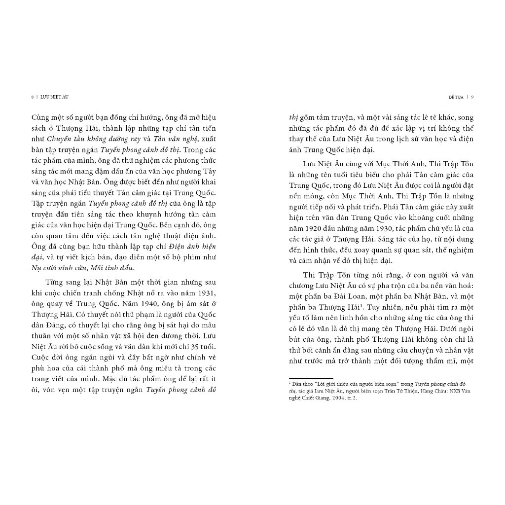 Tuyến phong cảnh đô thị là tuyển tập gồm tám truyện ngắn của Lưu Niệt Âu, được biết đến như sáng tác đầu tiên theo khuynh hướng tân cảm giác của văn học hiện đại Trung Quốc. Văn chương Lưu Niệt Âu có sự pha trộn của ba nền văn hoá, nhưng nếu phải tìm ra một yếu tố làm nên linh hồn cho tác phẩm của ông thì có lẽ chính là đô thị mang tên Thượng Hải. Dưới ngòi bút nhà văn, thành phố Thượng Hải đầu thế kỉ XX không còn chỉ là một thứ bối cảnh làm nền cho những câu chuyện tình yêu và nhân vật nam nữ mà đã trở thành một đối tượng thẩm mĩ, một thực thể độc lập, tràn đầy sức sống.