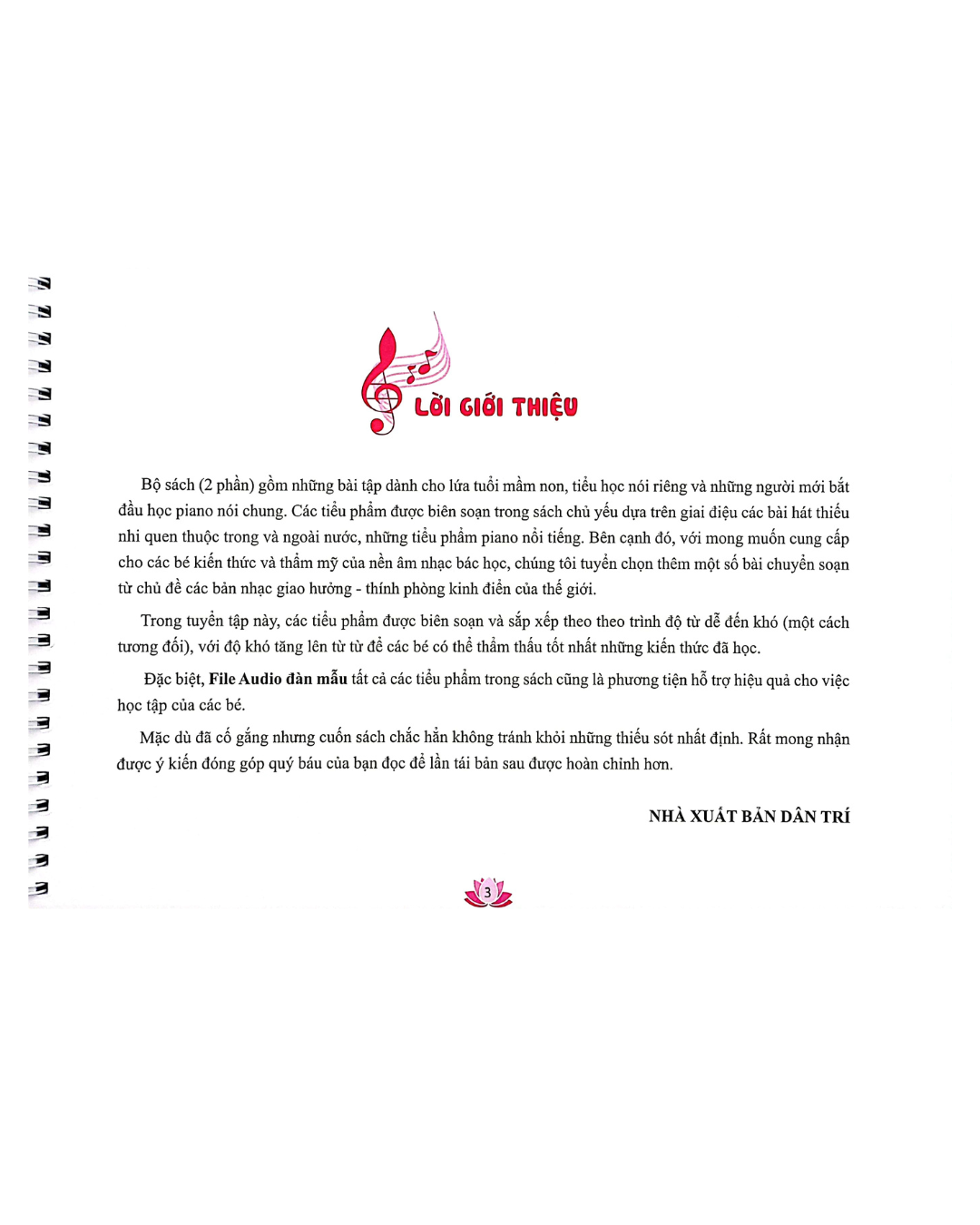 Bộ sách (2 phần) gồm những bài tập dành cho những lứa tuổi mầm non, tiểu học nói riêng và những người học mới piano nói chung. Các bài hát trong sách chủ yếu dựa