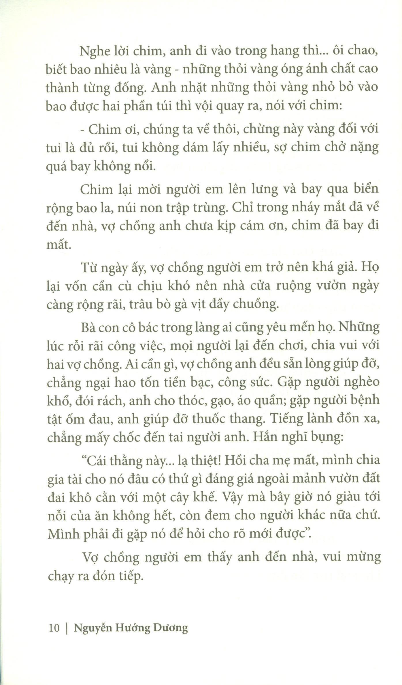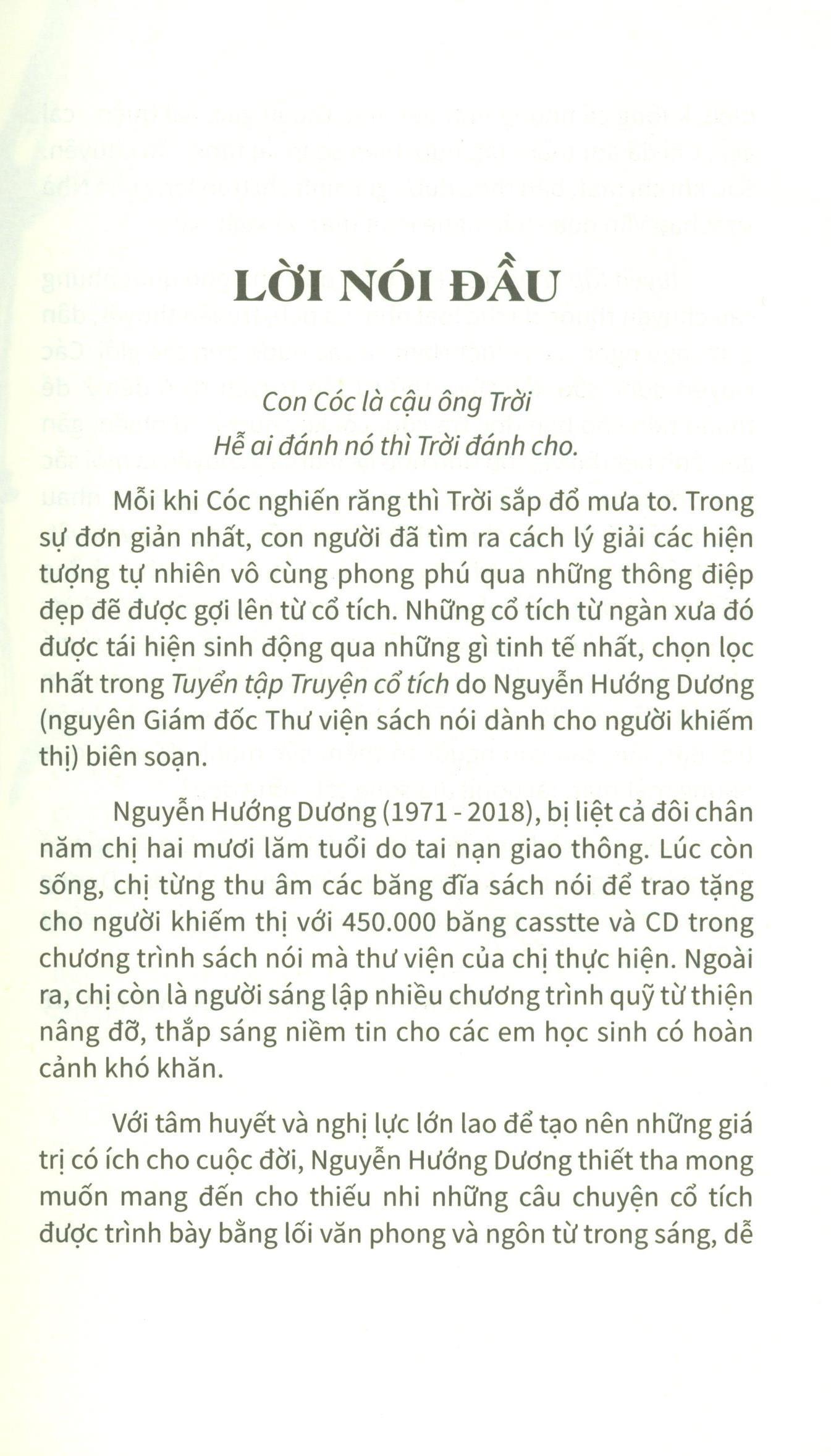 Với tâm huyết và nghị lực lớn lao để tạo nên những giá trị có ích cho cuộc đời, Nguyễn Hướng Dương thiết tha mong muốn mang đến cho thiếu nhi những câu chuyện cổ tích được trình bày bằng lối văn phong và ngôn từ trong sáng, dễ hiểu, không có những tình tiết mâu thuẫn giữa cái thiện - cái á Chị đã âm thầm tập hợp, biên soạn lại từng câu chuyện.