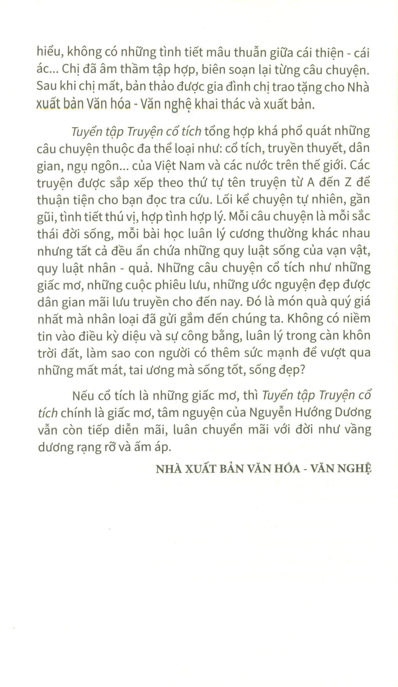 Nếu cổ tích là những giấc mơ, thì Tuyển tập Truyện cổ tích chính là giấc mơ, tâm nguyện của Nguyễn Hướng Dương vẫn còn tiếp diễn mãi, luân chuyển mãi với đời như vầng dương rạng rỡ và ấm áp.