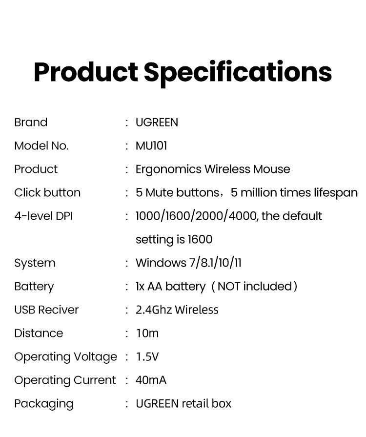1. Brand: UGreen 2. Product name: Wireless mouse 3. Model: MU105 4. Color : Celadon Green 5. Connection method: 2.4G wireless (USB receiver) 6. Working distance: 10 meters 7. Sensitivity: 800/1200/1600/2400 (four gears) 8. Return