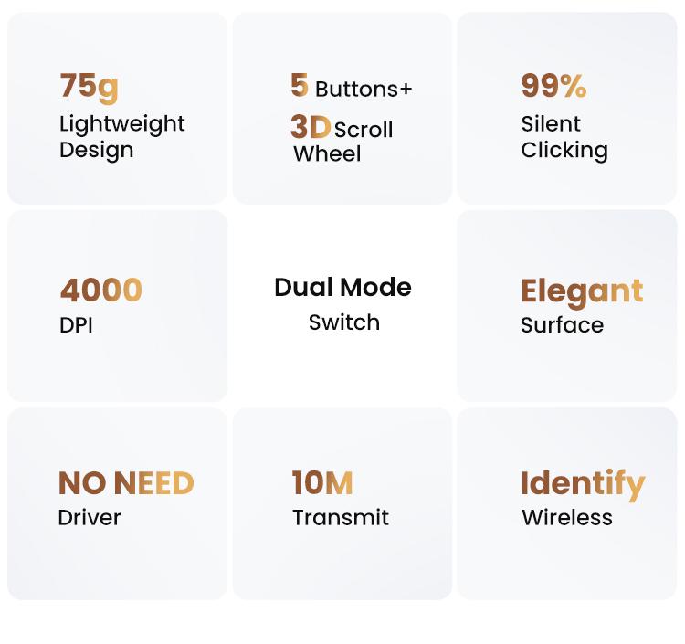 1.Operating distance: 15m/49.2ft 2.DPI: 800/1200/1600/2000/4000 3.Function: 6 buttons 4.Button lifespan: About 3 million clicks 5.Wi-Fi receiver operating frequency: 2.4 GHz bluetooth + 2.4ghz 6.Operating voltage: 1.5V 7.Operating current: 40mA 8.Insert AA batteries (product NOT included) 9.Compatible