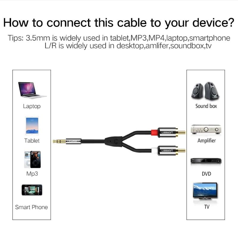 UGREEN AV102 cáp chuyển jack 3.5mm Stereo sang 2 cổng hoa sen RCA. Cáp sử dụng để kết nối điện thoại, thiết bị nghe nhạc IPod, MP3 player, máy tính bảng hoặc máy tính đến