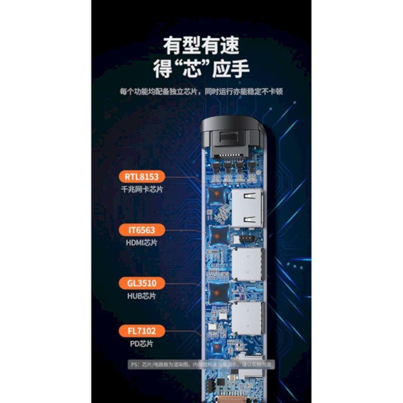 MÔ TẢ SẢN PHẨM Cổng loại C 11 trong 1: Tương thích HDMI + USB3.0 * 1 + USB2.0 * 3 + PD 87W + TF + SD + 100M RJ45 + AUX +
