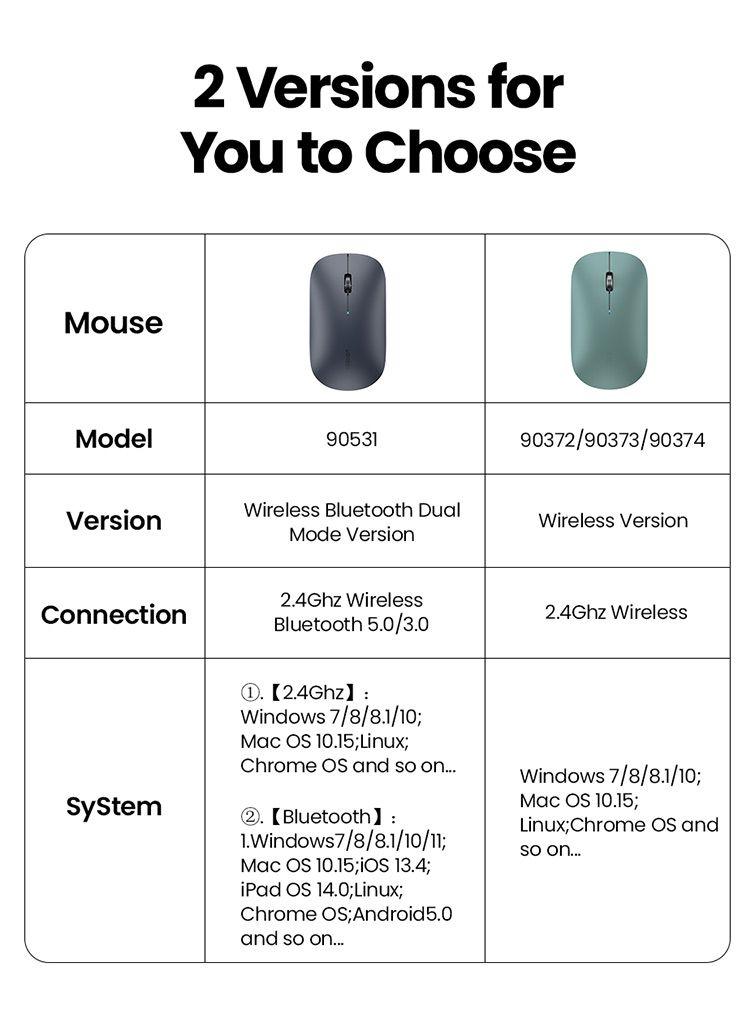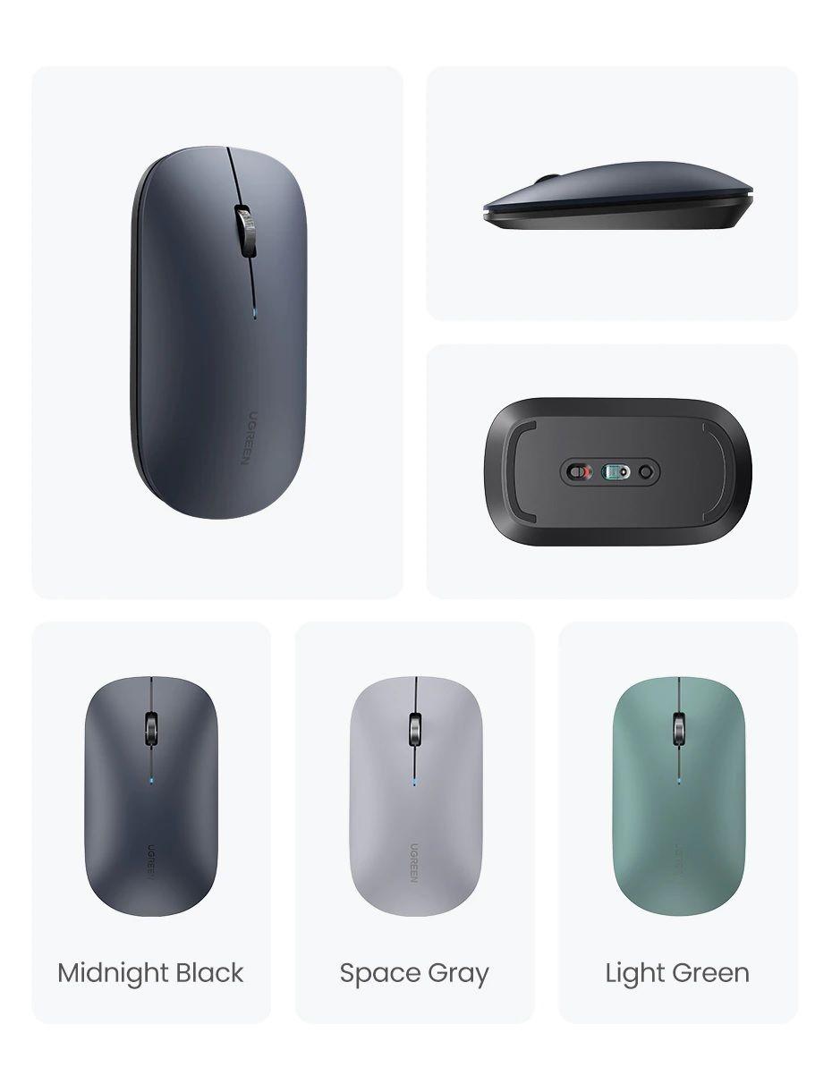 1. Brand: Ugreen 2. Product name: Wireless mouse + Bluetooth 3. Model: 90855 - MU006 4. Color : Black 5. Connection method: 2.4G wireless (USB receiver) + Bluetooth 5.0 6. Working distance: 15 meters 7.