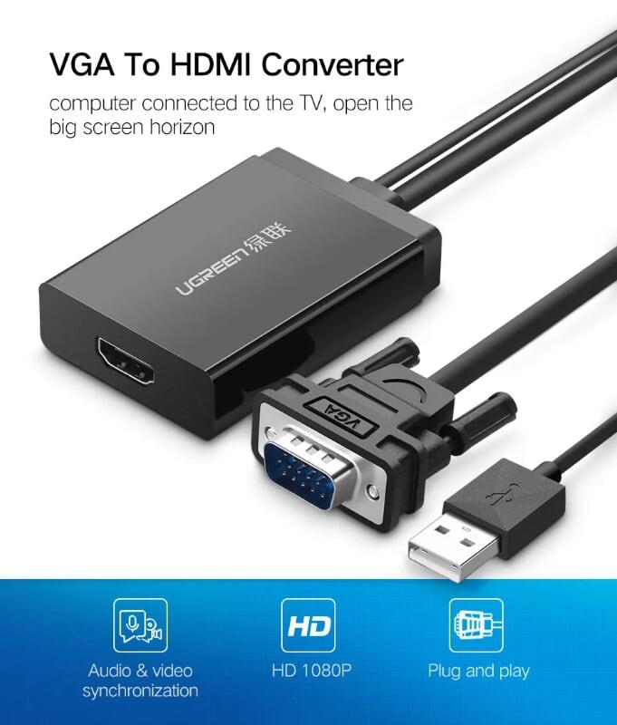 - Bộ Chuyển Đổi Ugreen HDMI Sang VGA Audio Cáp Tròn Có Nguồn Phụ 40253 giúp kết nối máy tính xách tay, Macbook, Chromebook, Rasberry Pi với giao diện HDMI để chiếu, hiển thị, màn hình