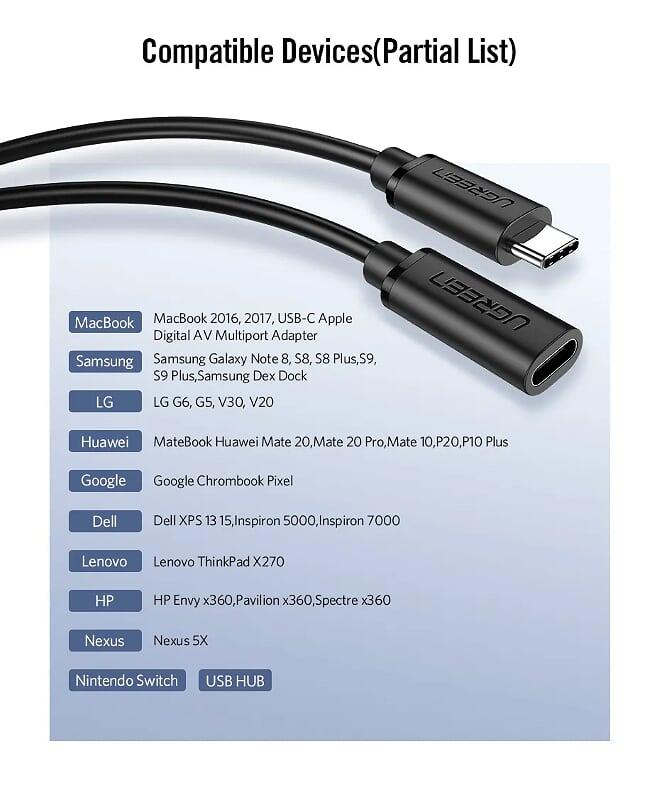 1. Feature: Extend the USB-C port. 2. Color: Black 3. Length: 50CM 4. Input: USB-C Male 5. Output: USB-C Female 6. Support data transfer up to 5Gbps. 7. Support resolution: 3840x2160 30HZ. 8. Support charging