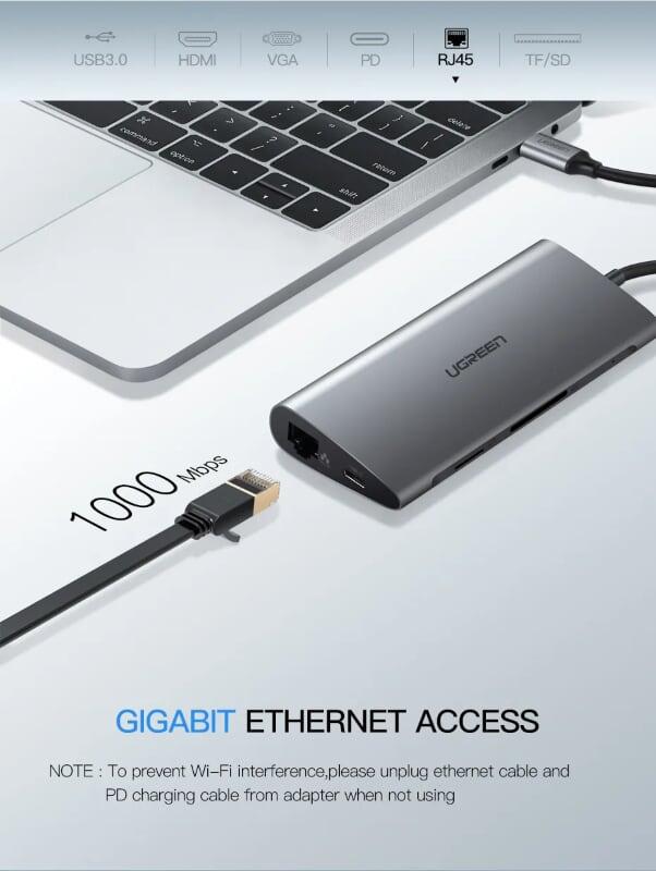 ✨Ugreen UG40873CM179TK Bộ chuyển đổi TYPE C sang 3 USB 3.0 + HDMI + VGA + LAN + SD TF + hỗ trợ nguồn TYPE C - HÀNG CHÍNH HÃNG