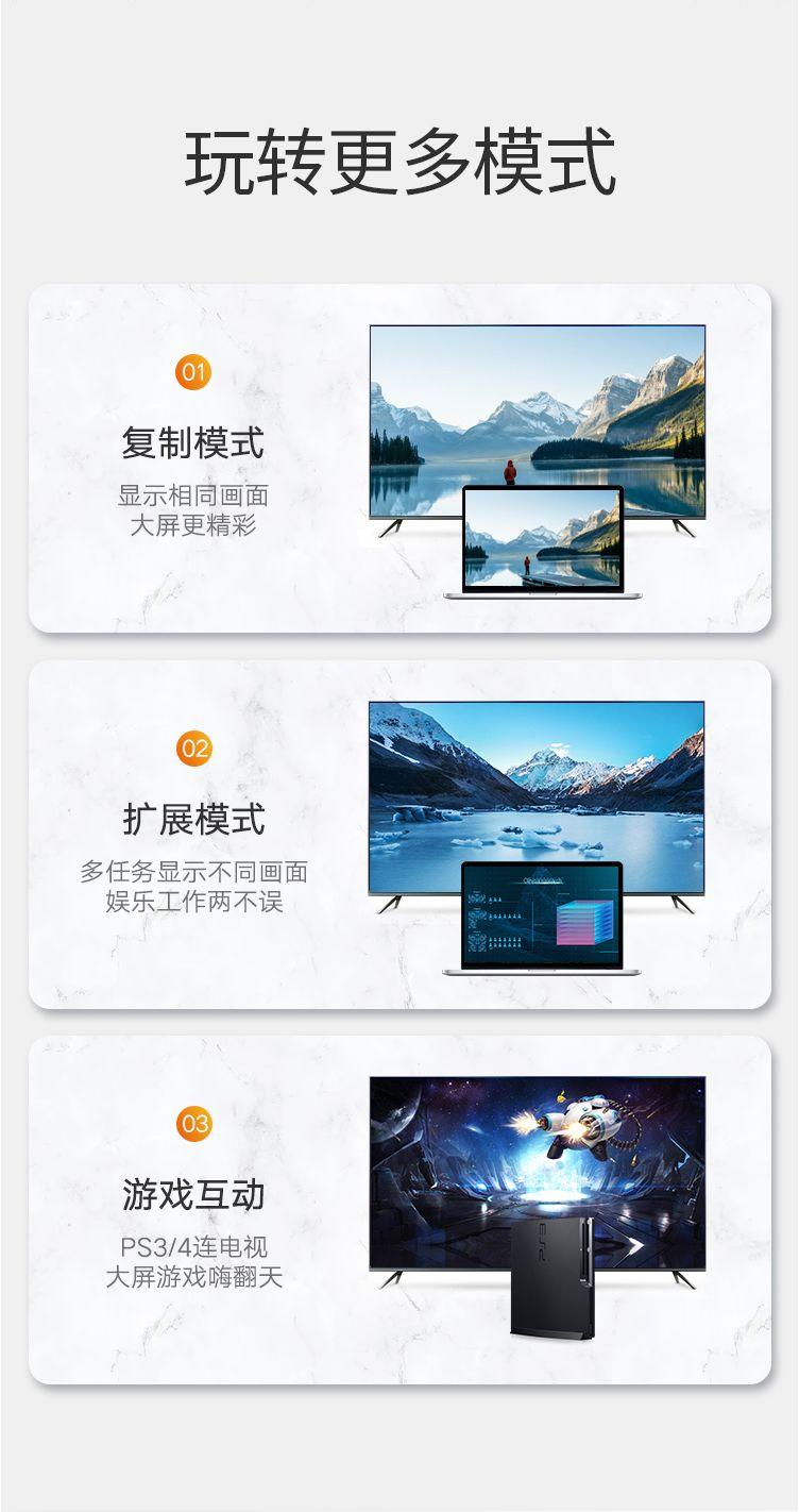 1. 8K resolution support at 60Hz and 4K resolution support at 120Hz for high-definition video and audio. 2. HDR (High Dynamic Range) support for improved color depth, contrast, and brightness. 3. Plug-and-play design, no additional
