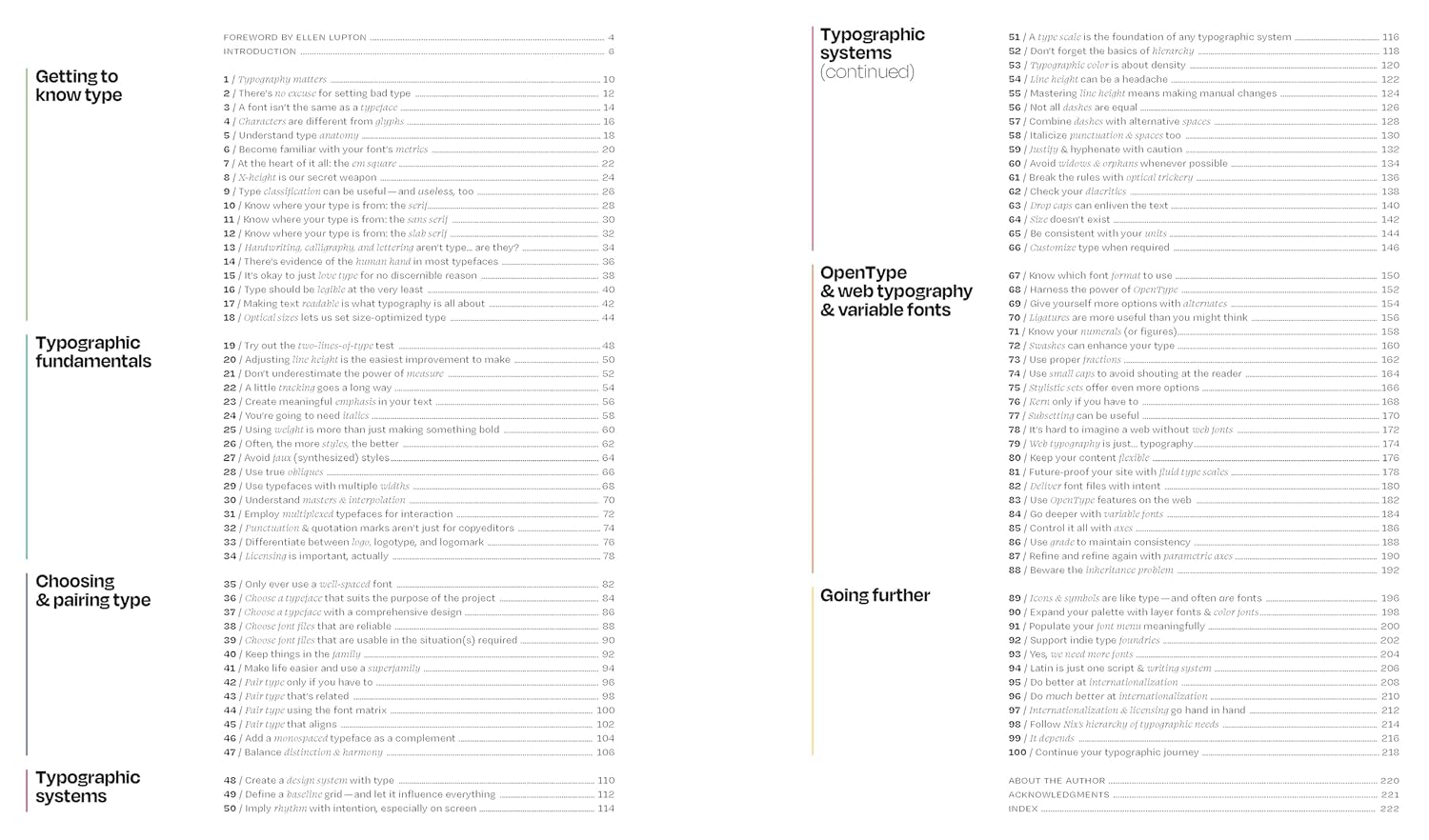 Explore 100 key concepts, theories, and guidelines that are critical for choosing and using type.We communicate with text every single day, but what does it mean to really understand type—to use it wi...