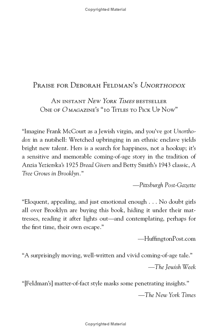 As a member of the strictly religious Satmar sect of Hasidic Judaism, Deborah Feldman grew up under a code of relentlessly enforced customs governing everything from what she could wear and to whom she could speak to what she was allowed to read. Yet in spite of her repressive upbringing, Deborah grew into an independent-minded young woman whose stolen moments reading about the empowered literary characters of Jane Austen and Louisa May Alcott helped her to imagine an alternative way of life among the skyscrapers of Manhattan. Trapped as a teenager in a sexually and emotionally dysfunctional marriage to a man she barely knew, the tension between Deborah’s desires and her responsibilities as a good Satmar girl grew more explosive until she gave birth at nineteen and realized that, regardless of the obstacles, she would have to forge a path—for herself and her son—to happiness and freedom.