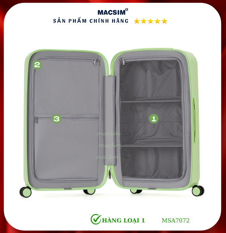 Vali cao cấp Macsim được làm từ chất liệu nhựa nguyên chất 3 lớp của hãng Bayer xuất xứ Đức. Tấm lót bên trong Poliester 150D xuất xứ Trung Quốc được REACH kiểm nghiệm và phê duyệt, bánh xe 360 độ hãng SJ của Mỹ; Khóa kéo thương hiệu YKK Nhật Bản, Khóa TSA hãng YIE Hồng Công. Tạo nên 1 sản phẩm đẹp, bền, chắc chắn tạo dấu ấn phong cách thời trang cá nhân của bạn trên mọi cuộc hành trình.