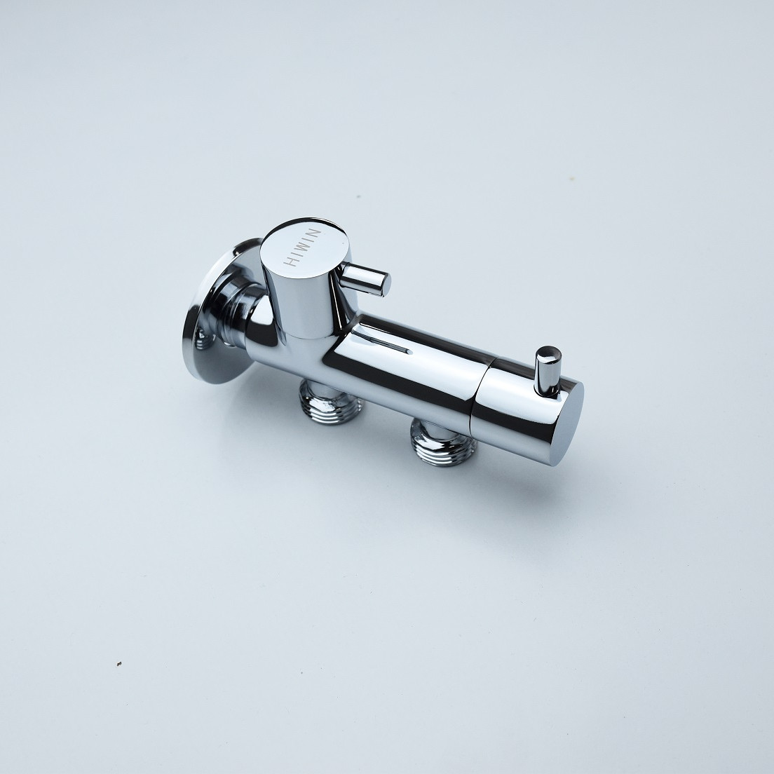 Van khóa chữ T chia hai đường nước 1 ngã cấp nước vào bồn cầu dây xịt vệ sinh, 1 ngã dùm để giảm áp lực nước Thân van được làm bằng đồng mạ chrome,