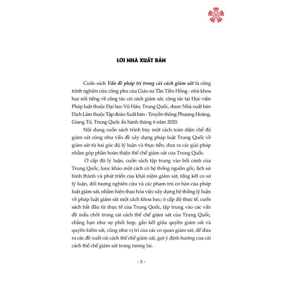 Mua tại TiktokCuốn sách được kết cấu gồm 5 phần, trình bày một cách toàn diện chế độ giám sát cũng như vấn đề xây dựng pháp luật Trung Quốc về giám sát từ hai góc độ lý luận và thực tiễn, đưa ra các giải pháp nhằm góp phần hoàn thiện thể chế giám sát của Trung Quốc. Đây là cuốn sách chuyên khảo có bố cục lôgích hoàn chỉnh và bối cảnh rõ ràng về cải cách thể chế giám sát của Trung Quốc, là tài liệu tham khảo bổ ích đối với các nhà nghiên cứu chuyên ngành luật cũng như đông đảo bạn đọc quan tâm đến chủ đề này.