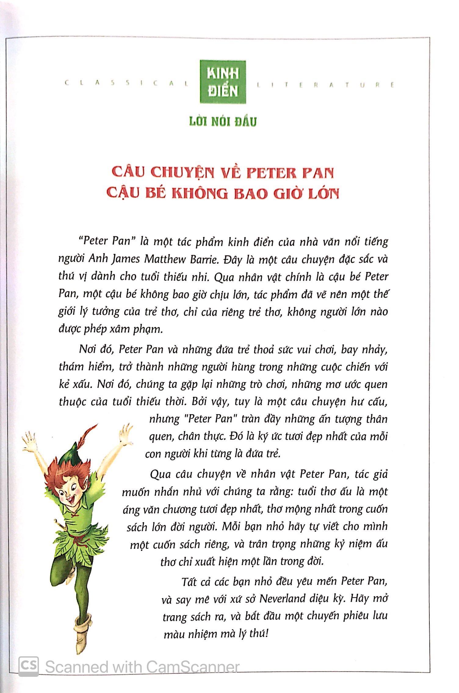 Mua tại TiktokPeter Pan được biết đến là đứa trẻ không bao giờ lớn. Anh chàng dạy 3 đứa trẻ là Wendy, John và Micheal học bay. Nhân lúc bố mẹ không có nhà, chúng đã bay đến xứ sở Neverland bí ẩn. Trên đảo có các nàng tiên nhỏ, đám cướp biển và các nàng tiên cá mà các em nhỏ đã quen thuộc trong truyện cổ tích. Trong câu chuyện, Peter và các bạn nhỏ được cùng nhau vui chơi và trải qua những chuyến du lịch mạo hiểm nhưng không kém phần thú vị. Thông qua hình tượng nhân vật Peter Pan, độc giả sẽ nhận ra rằng: tuổi thơ ấu là một áng văn chương tươi đẹp nhất, mơ mộng nhất trong một cuốn sách lớn của đời người. Mỗi bạn nhỏ, hãy tự viết cho mình một cuốn sách cuộc đời và tận hưởng những niềm vui thuộc về bản thân.