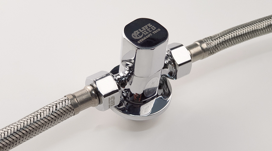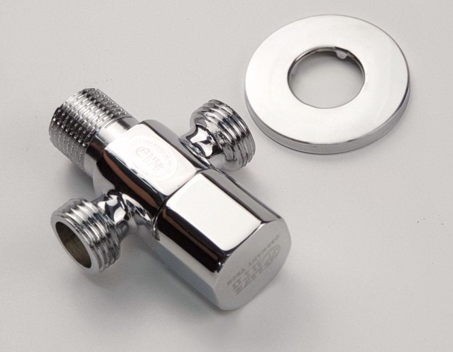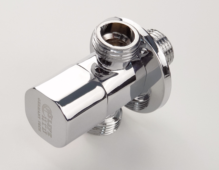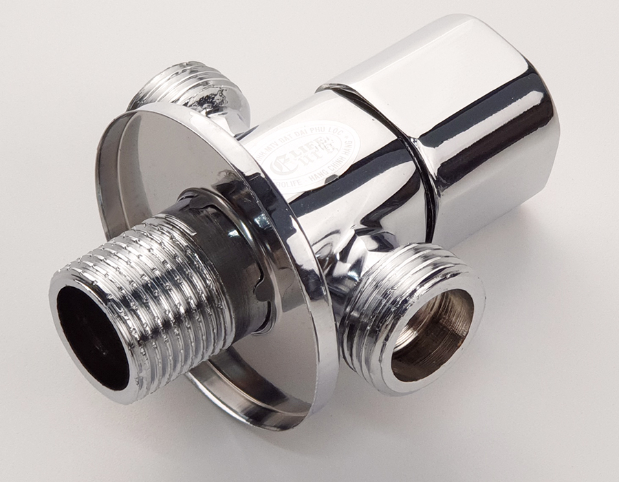 Van khóa chữ T chia hai đường nước 1 ngã cấp nước vào bồn cầu dây xịt vệ sinh, 1 ngã dùm để giảm áp lực nước Thân van được làm bằng đồng mạ chrome,