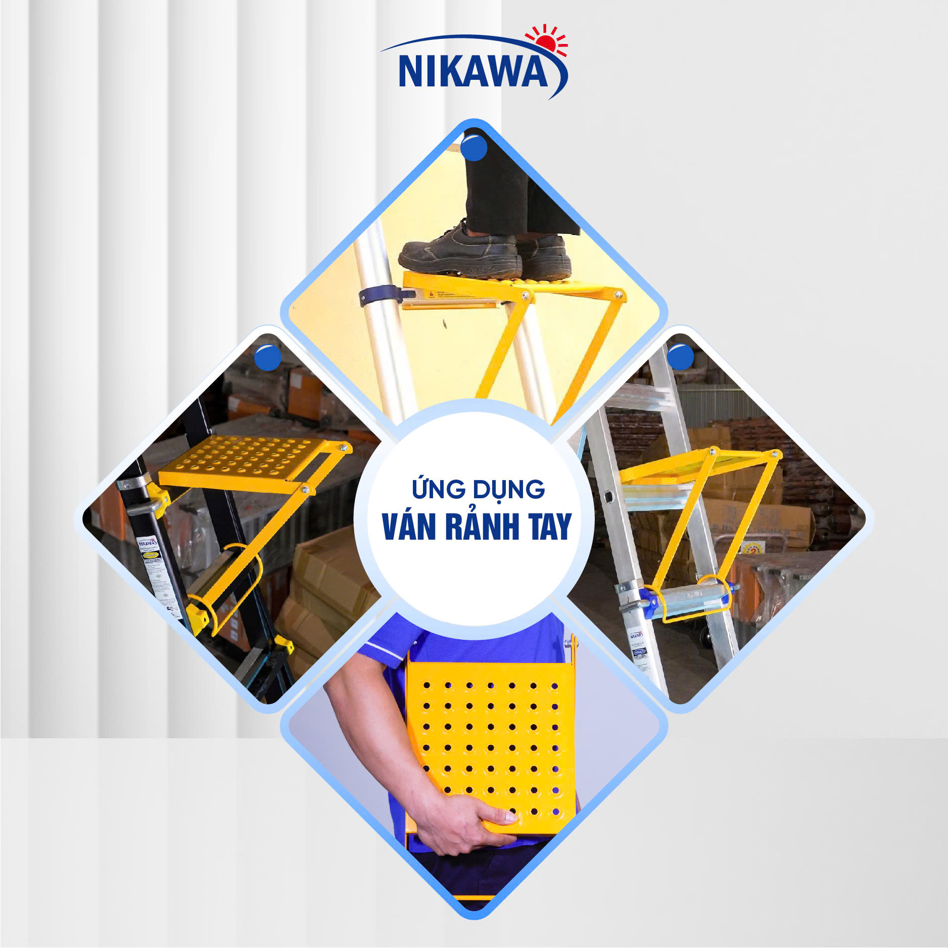 Ván thang rảnh tay Nikawa Bậc thang cơ động đa năng, gấp/rút linh hoạt, dùng được cho mọi loại thang như thang gấp, thang rút, thang chữ A, thang đa năng…. Bậc thang được thiết