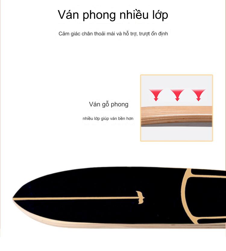 - DECK (MẶT VÁN) : Mặt ván được ép từ 7 lớp ván gỗ thông canada loại cao cấp trong 3 tháng sau đó mới mang đi cắt và bào để lắp ghép thành ván trượt thành phẩm.
