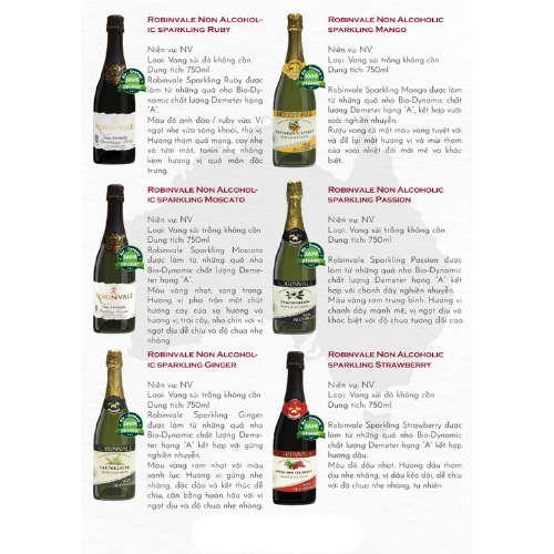 - Dung tích: 750ml Robinvale Grape Sparkling Ginger – Non Alcoholic là một thức uống vừa ngọt nhẹ vừa sảng khoái, thú vị được làm từ những quả nho Bio-Dynamic chất lượng Demeter hạng “A” kết hợp với gừng nghiền nhuyễn. Màu vàng rơm nhạt với màu xanh lục. Hương vị gừng nhẹ nhàng, độc đáo và kết thúc dễ chịu, cân bằng hoàn hảo với độ chua nhẹ nhàng.