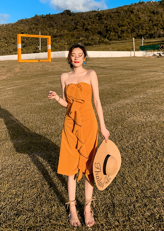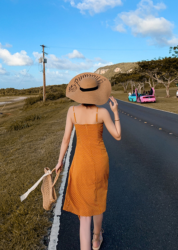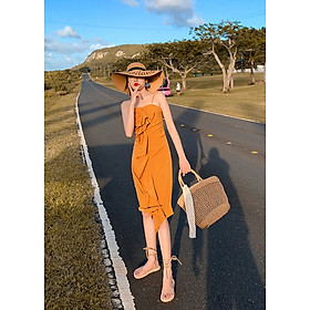 ✨Váy maxi 2 dây chấm bi vàng, bèo nhún cách điệu trước, tôn dáng, đầm voan đi biển cá tính, họa tiết chấm bi dễ mặc | MX053