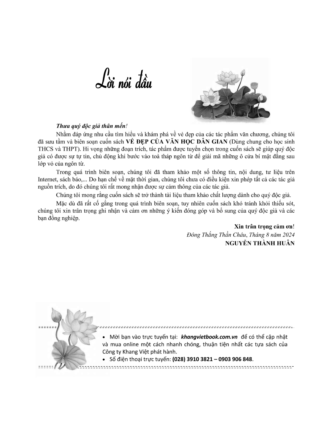 Nhằm đáp ứng nhu cầu tìm hiểu và khám phá về vẻ đẹp của các tác phẩm văn chương, chúng tôi đã sưu tầm và biên soạn cuốn sách VẺ ĐẸP CỦA VĂN HỌC DÂN GIAN (Dùng chung cho học sinh THCS và THPT). Hi vọng những đoạn trích, tác phẩm được tuyển chọn trong cuốn sách sẽ giúp quý độc giá có được sự tự tin, chủ động khi bước vào toà tháp ngôn từ để giải mã những ô cửa bí mật đằng sau lớp vỏ của ngôn từ.
