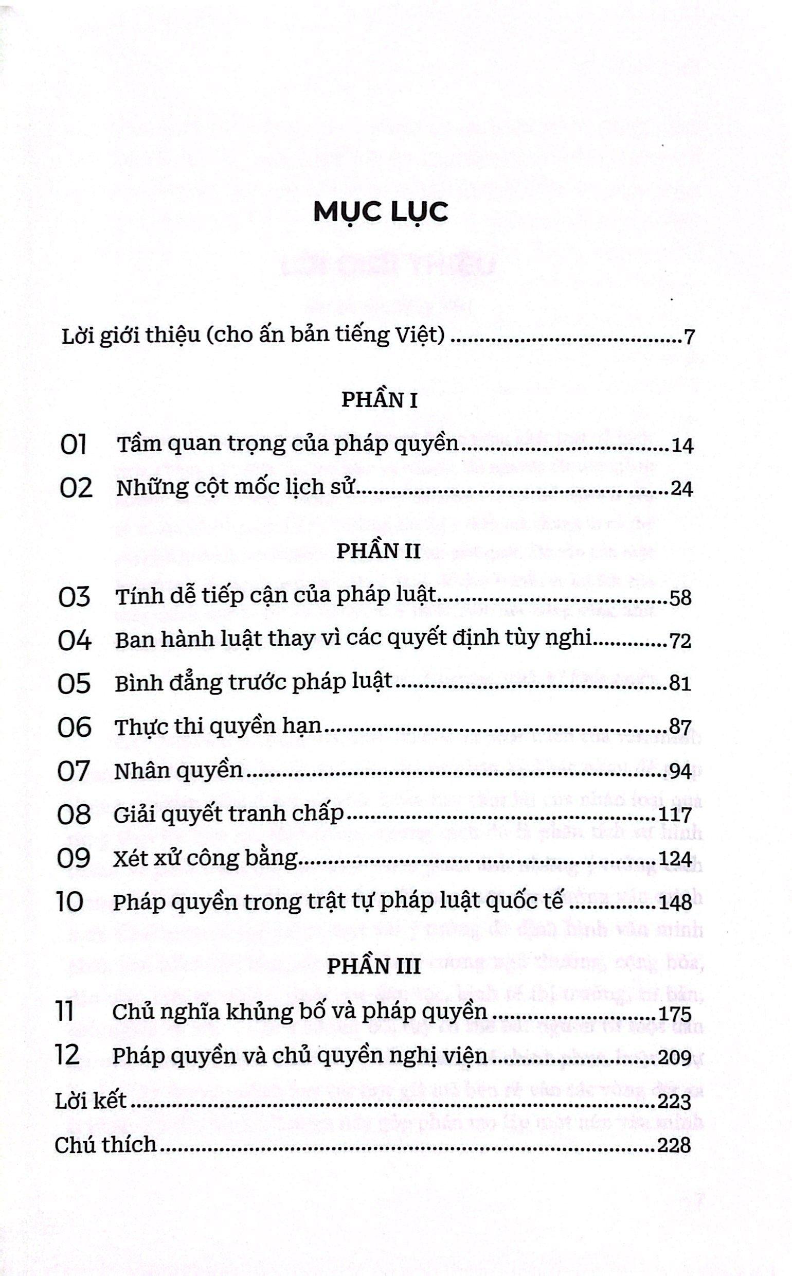 Mua tại TiktokVề Pháp Quyền Trong “Về Pháp Quyền”, Tom Bingham, một trong những bộ óc sắc bén nhất thế giới về pháp lý, đã bàn luận về ý nghĩa của pháp quyền. Theo ông, pháp quyền không phải là một học thuyết pháp lý khô khan mà là nền tảng thực sự của một xã hội công bằng, là sự bảo đảm của một chính phủ có trách nhiệm, có đóng góp quan trọng cho sự phát triển kinh tế, đồng thời cũng góp phần đàm bảo hòa bình và sự hợp tác giữa các quốc gia. Cuốn sách trình bày ngắn gọn về lịch sử của nguyên tắc pháp quyền, tám yếu tố cơ bản tóm gọn bản chất của khái niệm này, đồng thời thảo luận về những căng thằng đối với pháp quyền đến từ chủ nghĩa khủng bố quốc tế. Sách có ba phần chính: