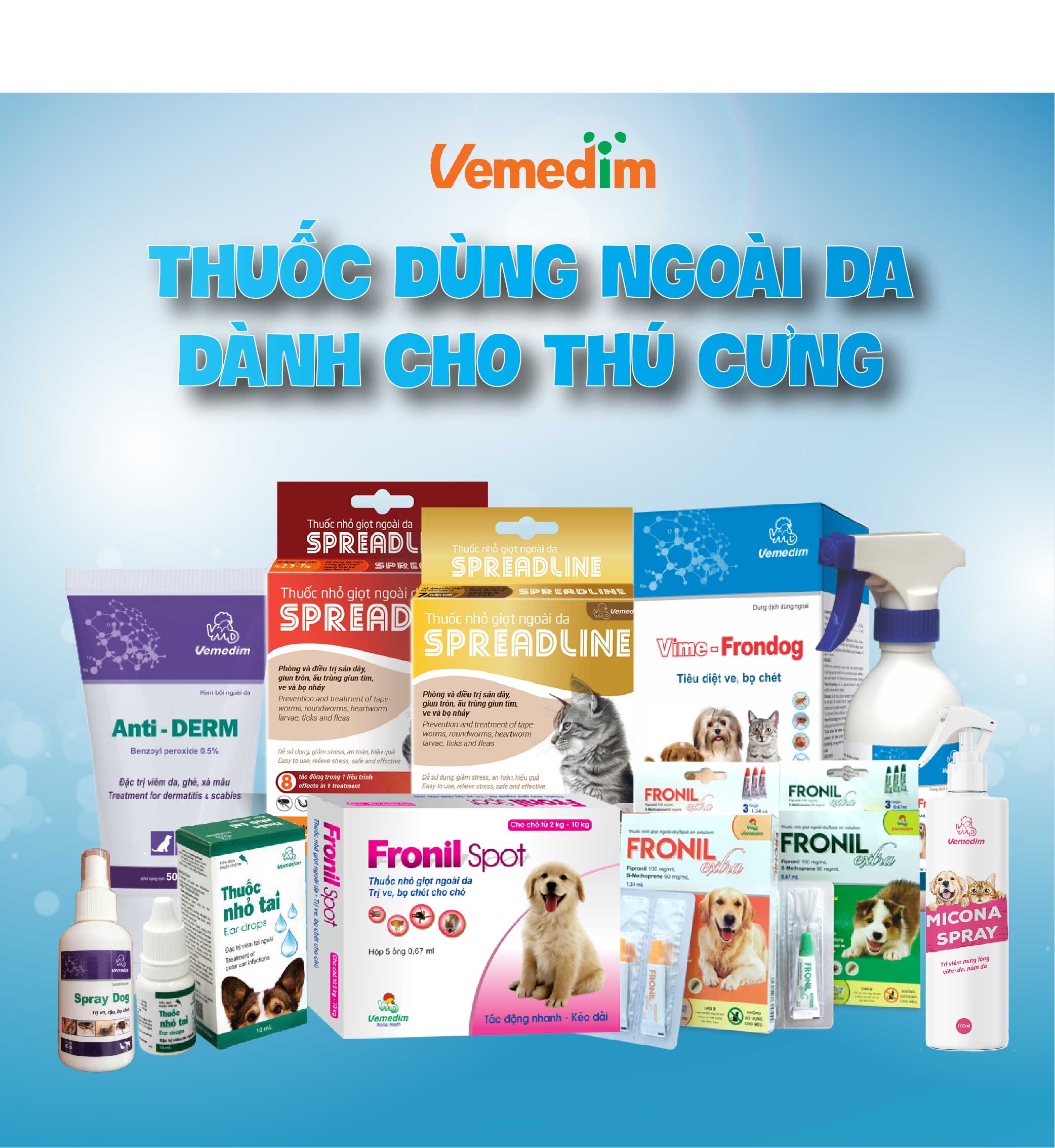 - Thuốc Trị Ve Ghẻ Nhỏ Sống Lưng, Nhỏ Tai Chó Vemedim Fronil Spot một ống 0.67ml/con trọng lượng từ 2-10kg. Nhỏ thuốc trực tiếp lên da. - Để đứng và đưa ống thuốc xa