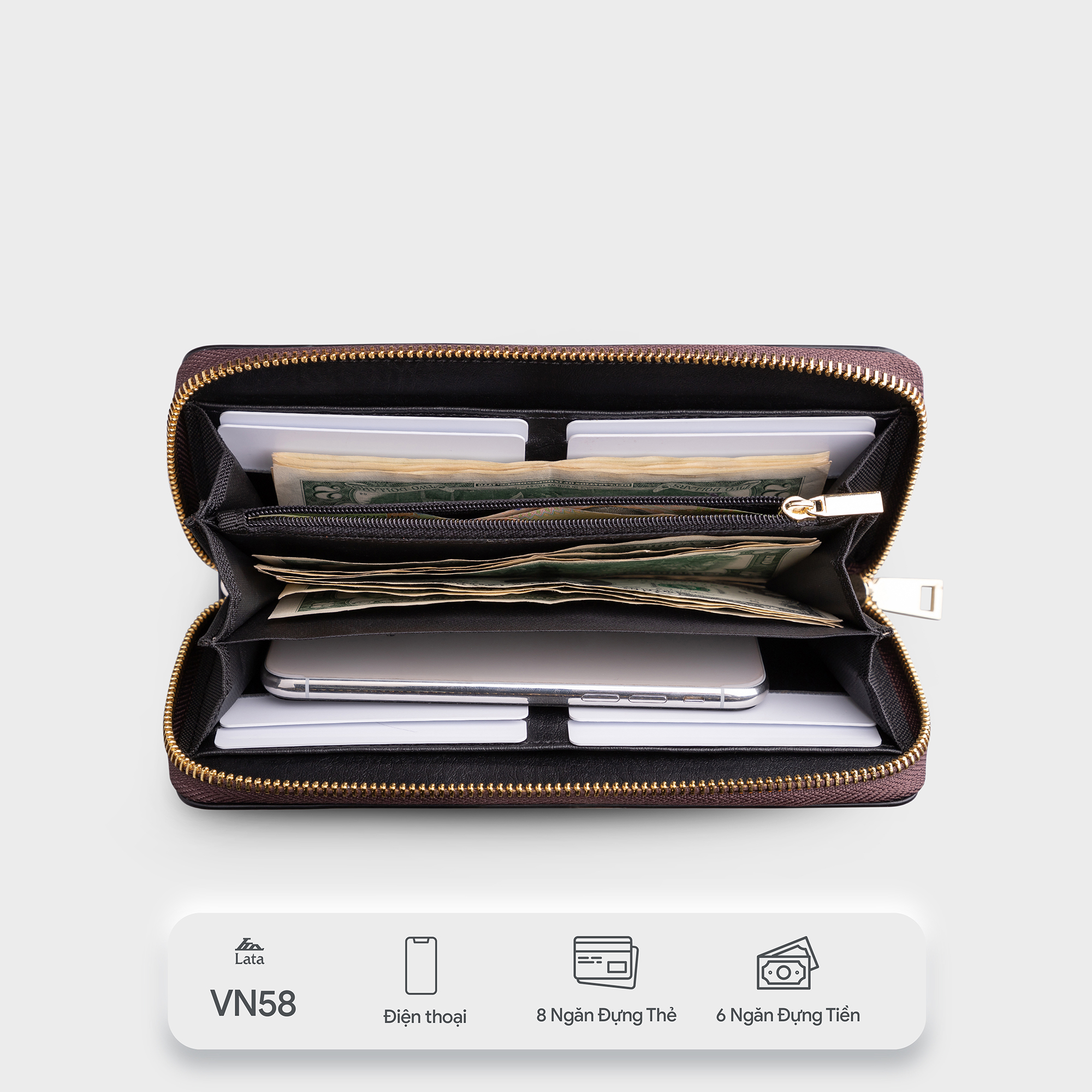 Ví da nữ cầm tay dáng ngang Lata VN58 được làm thiết kế kiểu dáng khóa kéo đơn giản, dễ sử dụng. Chất da mềm, đẹp, đầu khóa kim loại chắc chắn. Bên trong chiếc ví có đầy đủ các ngăn để đựng tiền, thẻ, giấy tờ tùy thân. Sản phẩm có thể mang sử dụng hằng ngày, đi làm, đi tiệc, hoặc làm quà tặng.