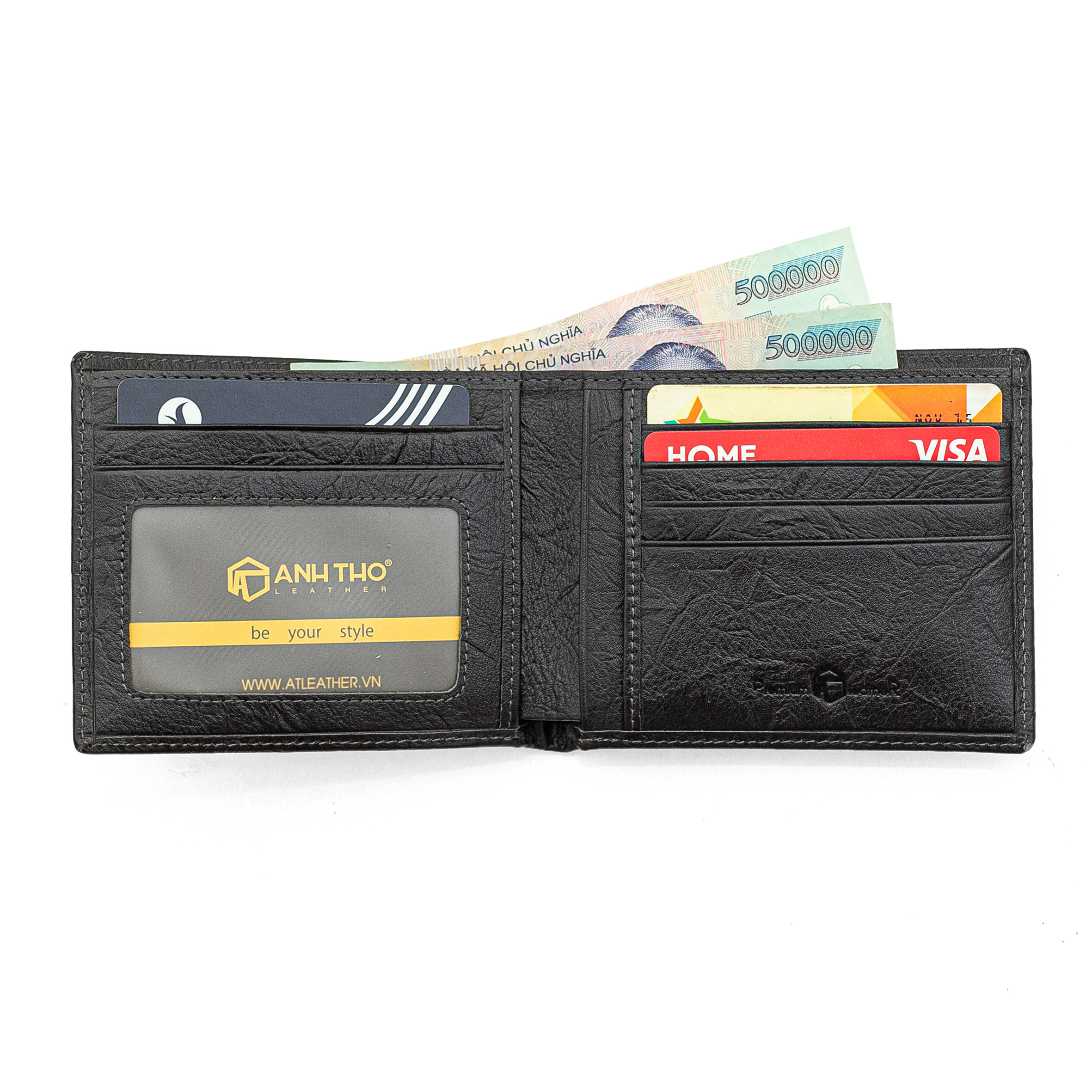 2 ngăn lớn, 1 ngăn dây kéo, 09 ngăn đựng thẻ, 1 ngăn bóng kiếng