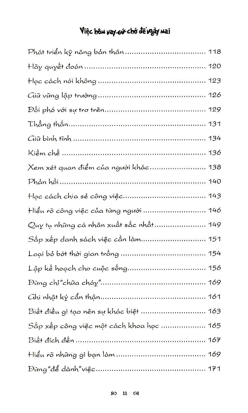 Những người này nắm được bí quyết mà chúng ta không biết. Họ biết phương pháp giải quyết một khối lượng lớn công việc mà không sợ hãi, cách duy trì sự phấn chấn trong khi làm việc cũng như làm sao thức dậy vào buổi sáng hôm sau và tiếp tục làm mà không cảm thấy căng thẳng, chán nản hay đau khổ. Và tôi nhận ra rằng đó là do họ có rất nhiều chiến lược và thực sự không phải quá vất vả. Điều này nghe có vẻ thật đơn giản, phải không nào?” – Trích “Việc hôm nay chớ để ngày mai.”