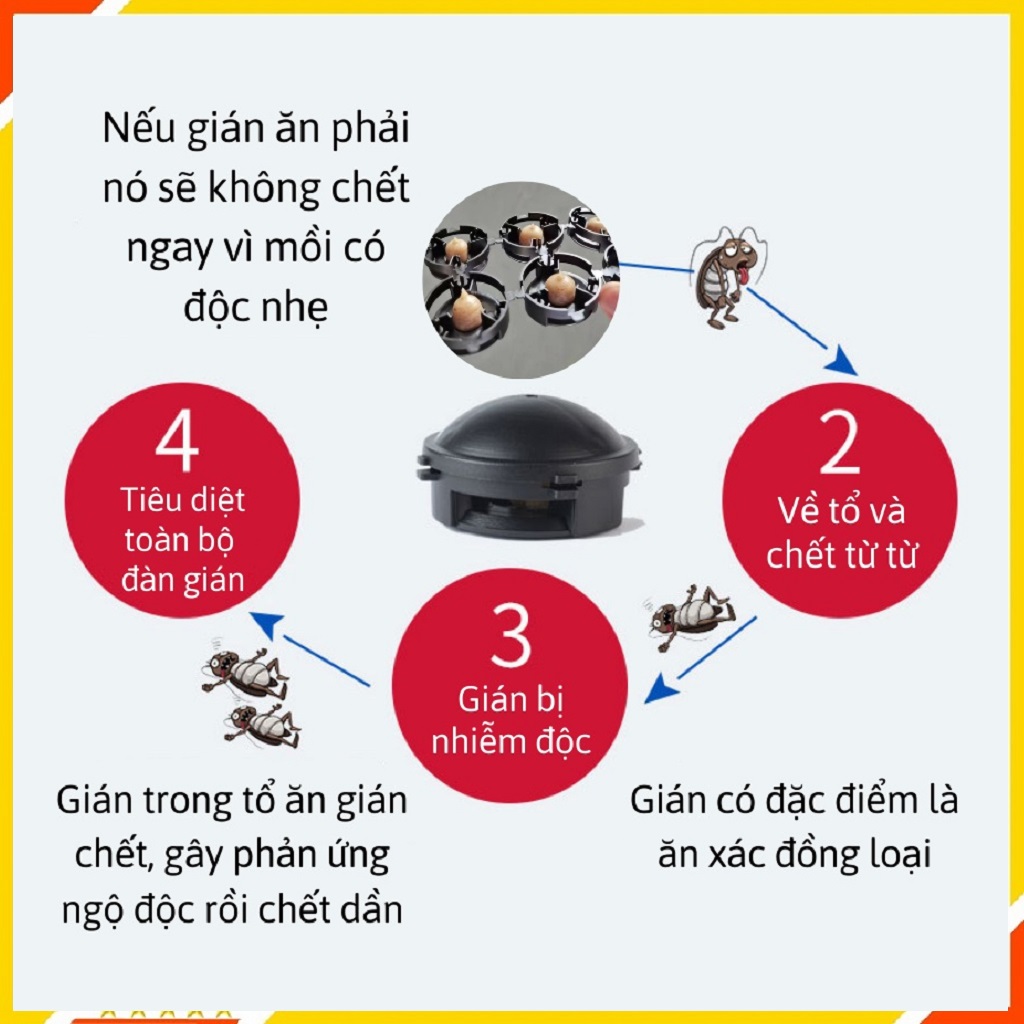Cơ chế diệt gián: Viên diệt gián thu hút gián tới ăn, Gián sẽ tha về tổ khiến cho cả đàn bị tiêu diệt. Gián sẽ biến mất hoàn toàn khỏi nhà bạn chỉ sau 2 – 5 ngày sử dụng. Thời gian sử dụng 6 tháng.Gia đình bạn sẽ hoàn toàn yên tâm. Không còn lo lắng về gián nữa.