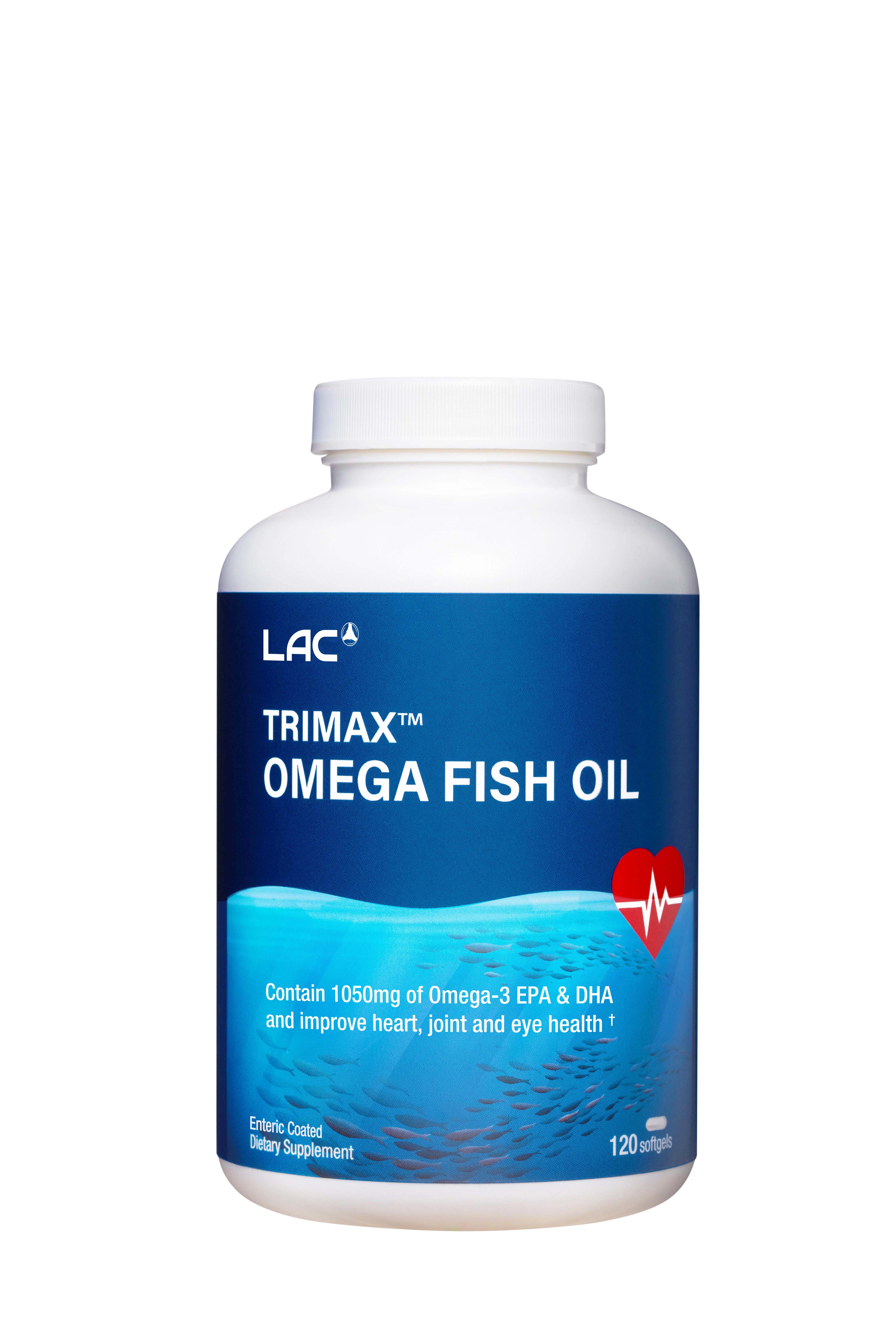 VIÊN UỐNG DẦU CÁ BỔ SUNG OMEGA HỖ TRỢ TIM MẠCH LAC TRIMAX OMEGA FISH OIL (120 VIÊN) chứa hàm lượng axit béo Omega-3 gấp 3 lần so với dầu cá thông thường giúp hỗ trợ tim mạch, tăng cường chức năng não và phục hồi sức khỏe khớp. THÔNG TIN SẢN PHẨM Đặc tính nổi bật Viên nang mềm LAC Trimax Omega Fish Oil được phủ lớp bảo vệ dạ dày để giảm khả năng gây ra cảm giác buồn nôn từ mùi tanh của dầu cá. Dầu cá được tinh chế, phù hợp sử dụng dài hạn mà không cần lo lắng về các kim loại nặng có hại có thể có trong một số loại cá ngày nay Công dụng