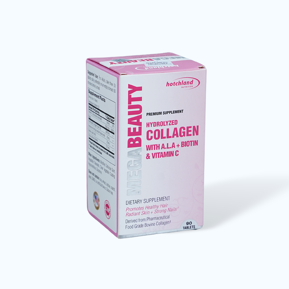 - Alpha Lipoic Acid 25 mg, Biotin 1500 mcg, Silic dioxit Phụ liệu Modified Cellulose Gum, Vegetable Stearates, Clear Vegetable Coating: Hypromellose, Glycerine. Trong sản phẩm không chứa Đậu nành, lúa mì, lactose, tinh bột, men, GMO, hoặc hương vị nhân tạo. Không chứa gluten. Công dụng của Viên uống Hotchland MegaBeauty Sản phẩm mang lại những tác dụng như: