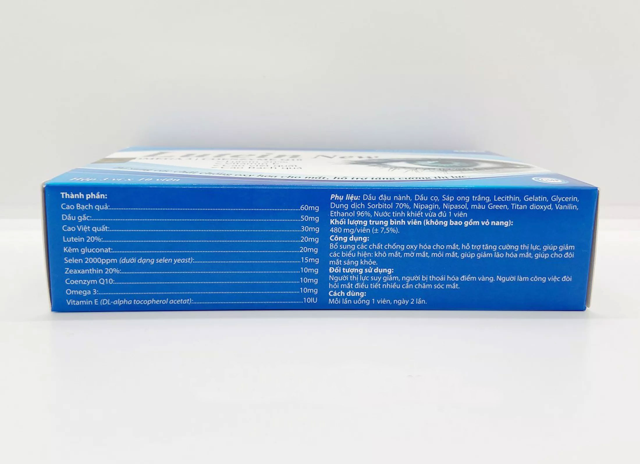 Viên uống bổ mắt LUTEIN NEW tăng cường thị lực – Hộp 30 viên THÀNH PHẦN: Cao bạch quả: 60mg Dầu gấc: 50mg Cao việt quất: 30mg Lutein 20%: 20mg Kẽm gluconat : 20mg Selen 200ppm: 15mg Zeaxanthin20%: 10mg Coezym Q10: 10mg Omega 3: 10mg Vitamin E: 10IU CÔNG DỤNG: _Bổ sung các chất chống oxy hóa cho mắt. _Hỗ trợ tăng cường thị lực. _Giúp giảm các biểu hiện : khô mắt, mờ mắt, mỏi mắt. _Giúp giảm lão hóa mắt, giúp cho đôi mắt sáng khỏe. ĐỐI TƯỢNG SỬ DỤNG: _Người thị lực suy giảm, người bị thóa hóa điểm vàng. _Người làm công việc đòi hỏi mắt điều tiết nhiều cần chăm sóc mắt. CÁCH DÙNG: Mỗi lần uống 1 viên, ngày 2 lần. BẢO QUẢN : Bảo quản nơi khô ráo thoáng mát tránh ánh nắng trực tiếp LƯU Ý: Sản phẩm này không phải là thuố, không có tác dụng thay thế thuốc.